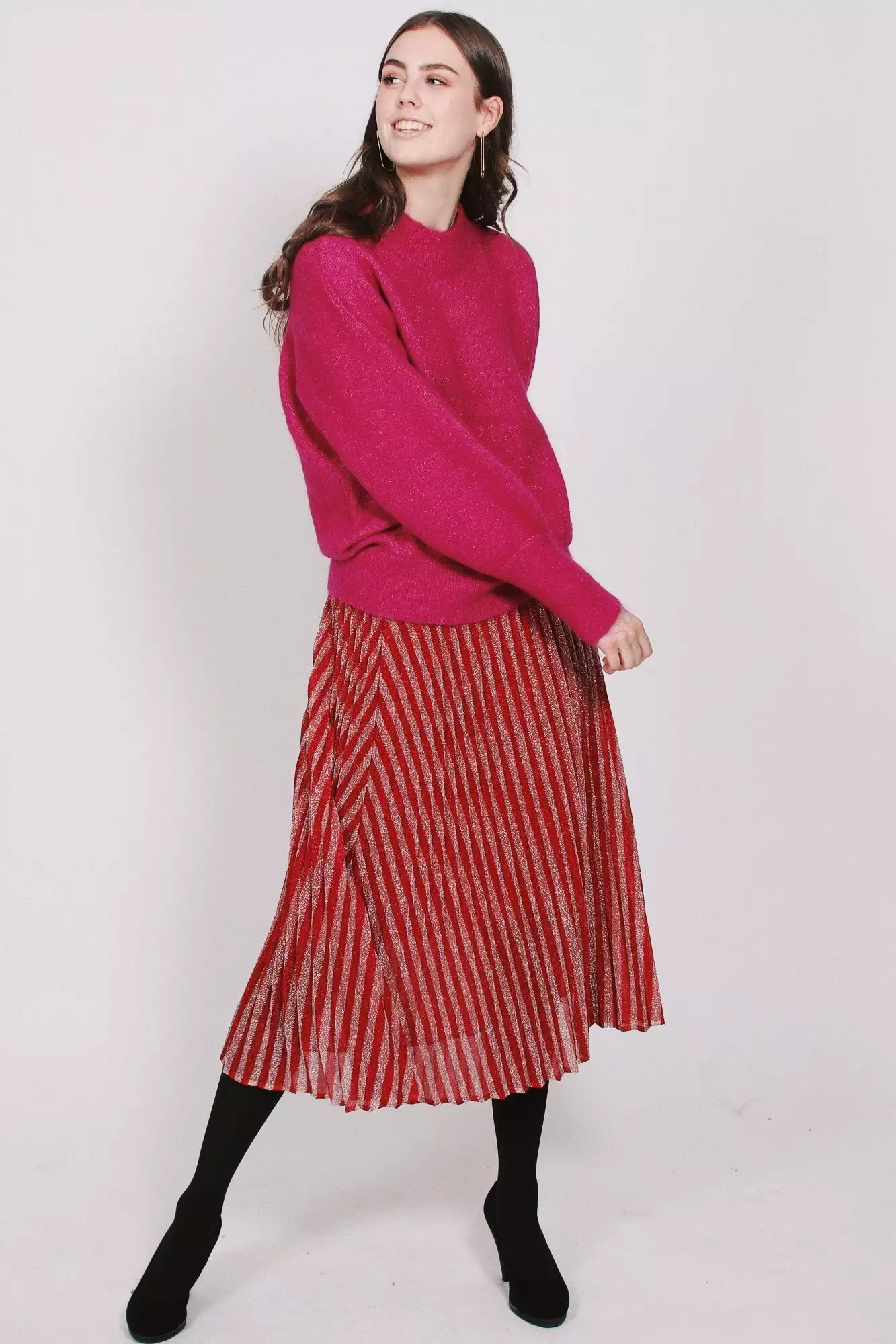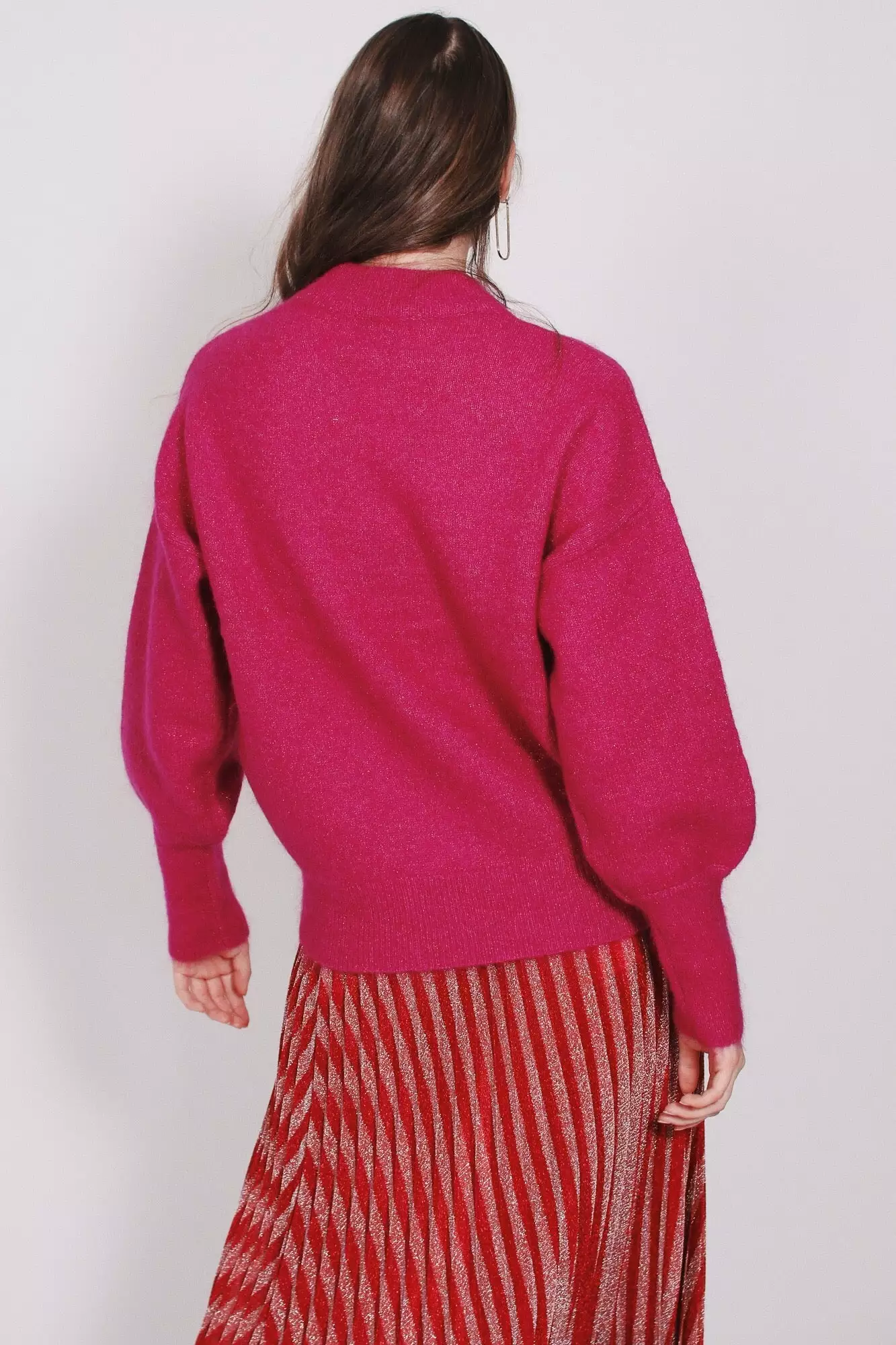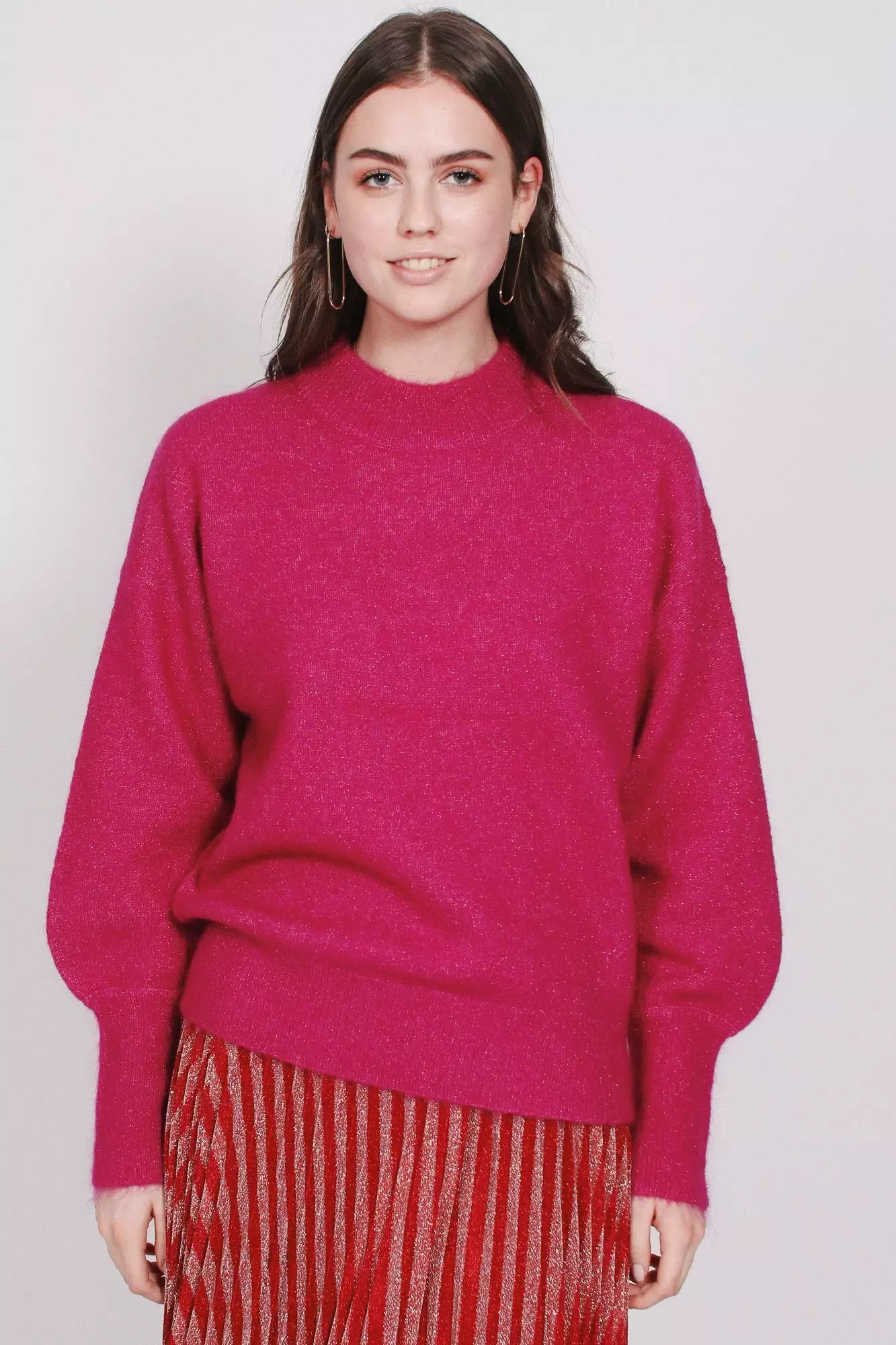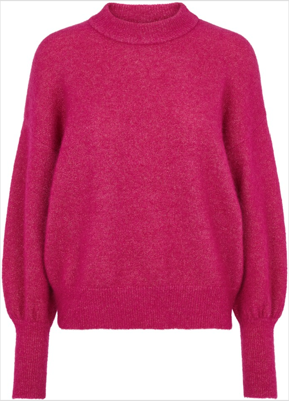 Minnelli Knit Loose O-Neck fra Second Female. Nydelig cerise genser med dekorative glittertråder. Genseren er i myk mohairblanding og har rund hals og brede vrangborder. Løs fasong.