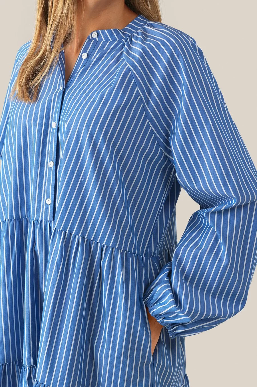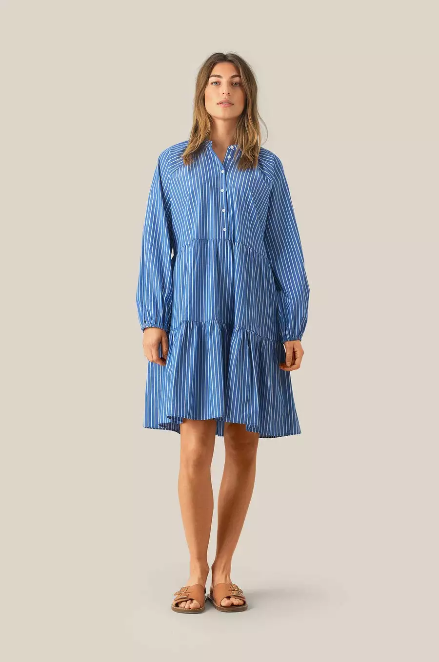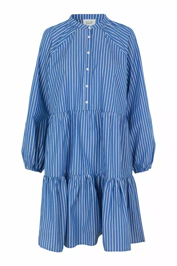 Miracle Dress fra Second Female. Nydelig sommerkjole laget i et lett crispy bomullsstoff. Kjolen er blå med hvite striper og har knapper øverst på brystet. Lange ermer med strikk nederst. Løs passform.