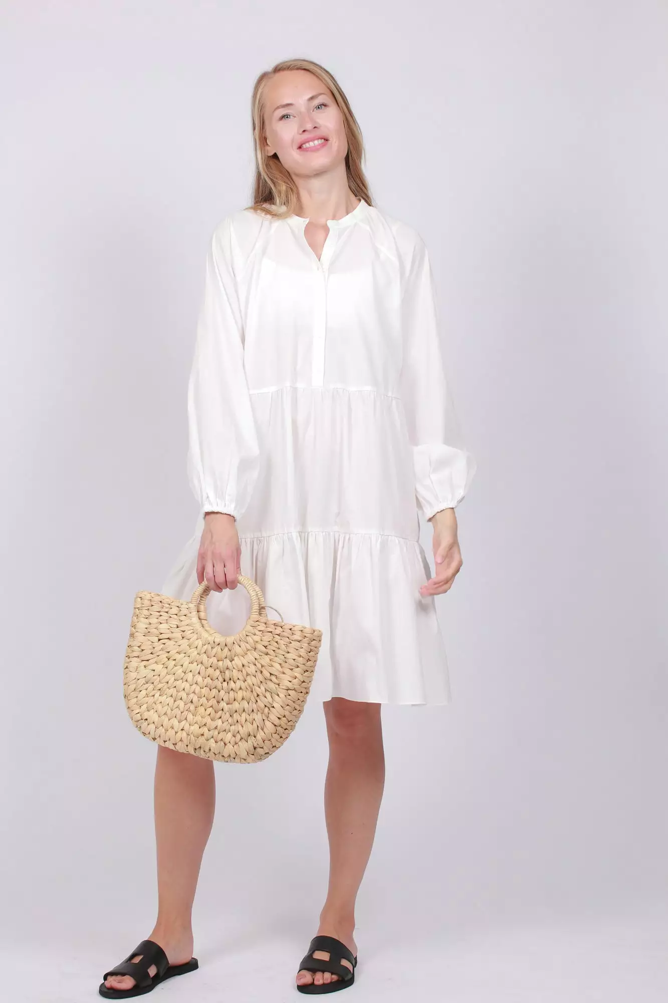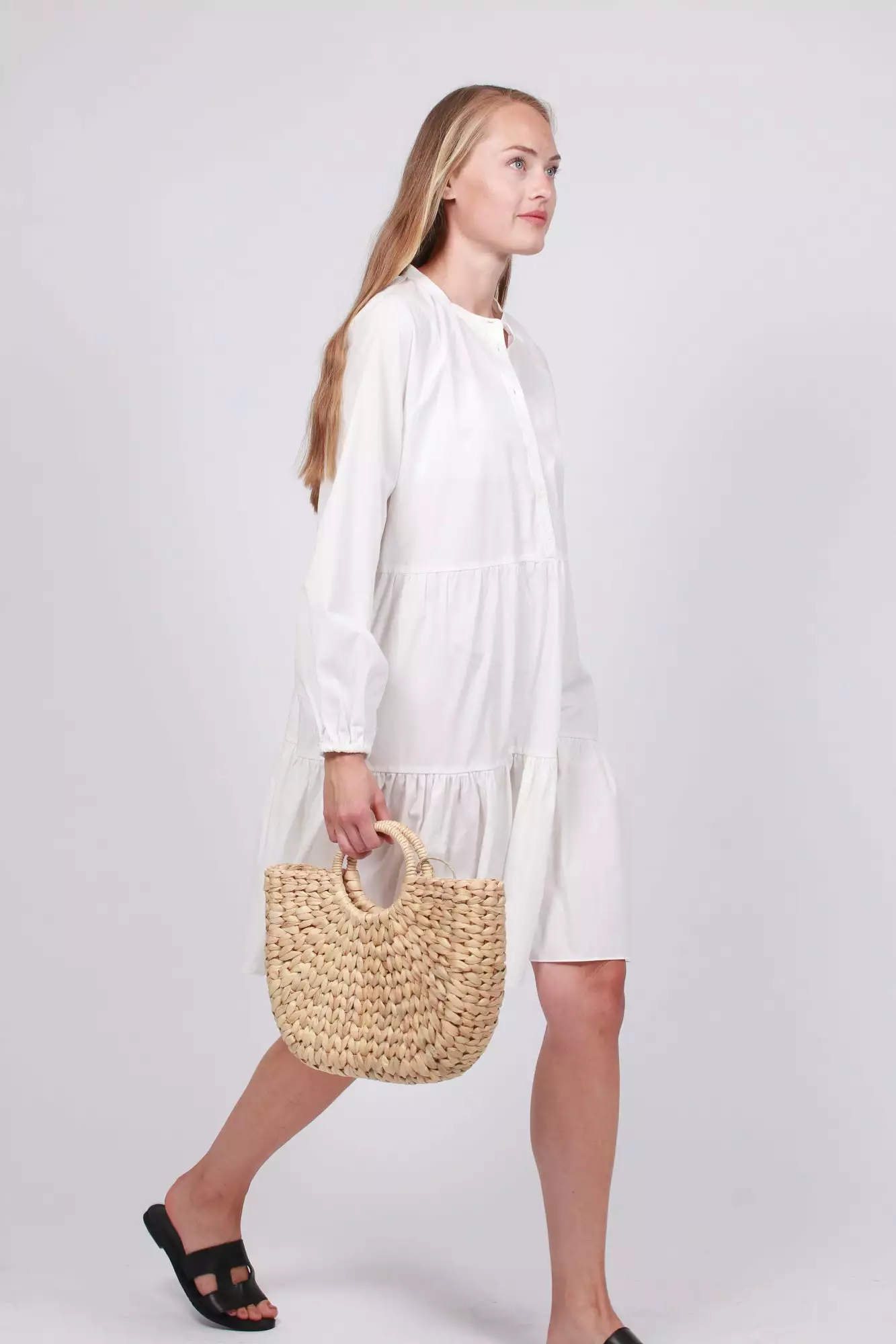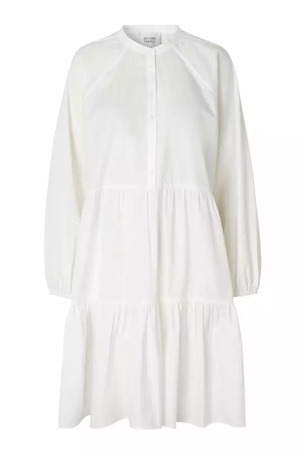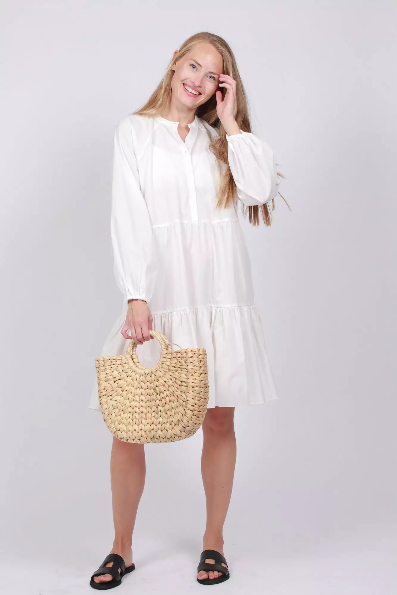 Miracle Dress fra Second Female. Nydelig sommerkjole laget i et lett crispy bomullsstoff. Kjolen er løs i passformen og har knapper øverst på brystet. Lange ermer med strikk nederst.