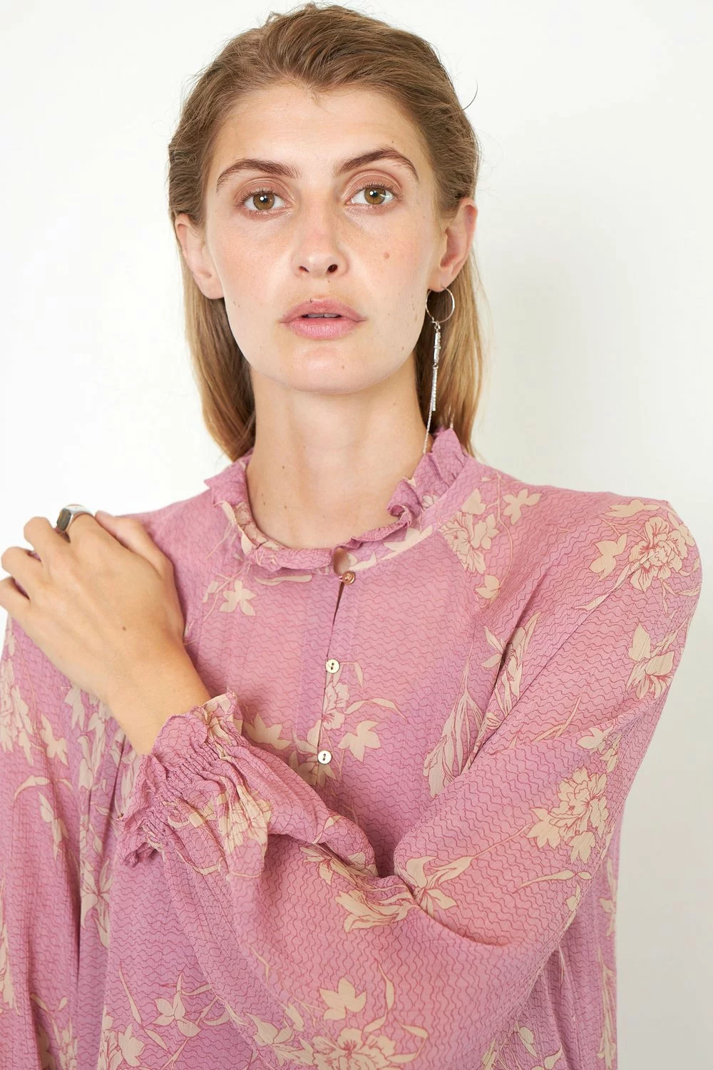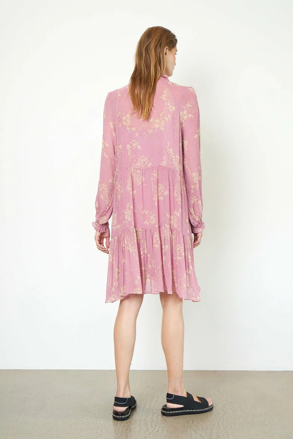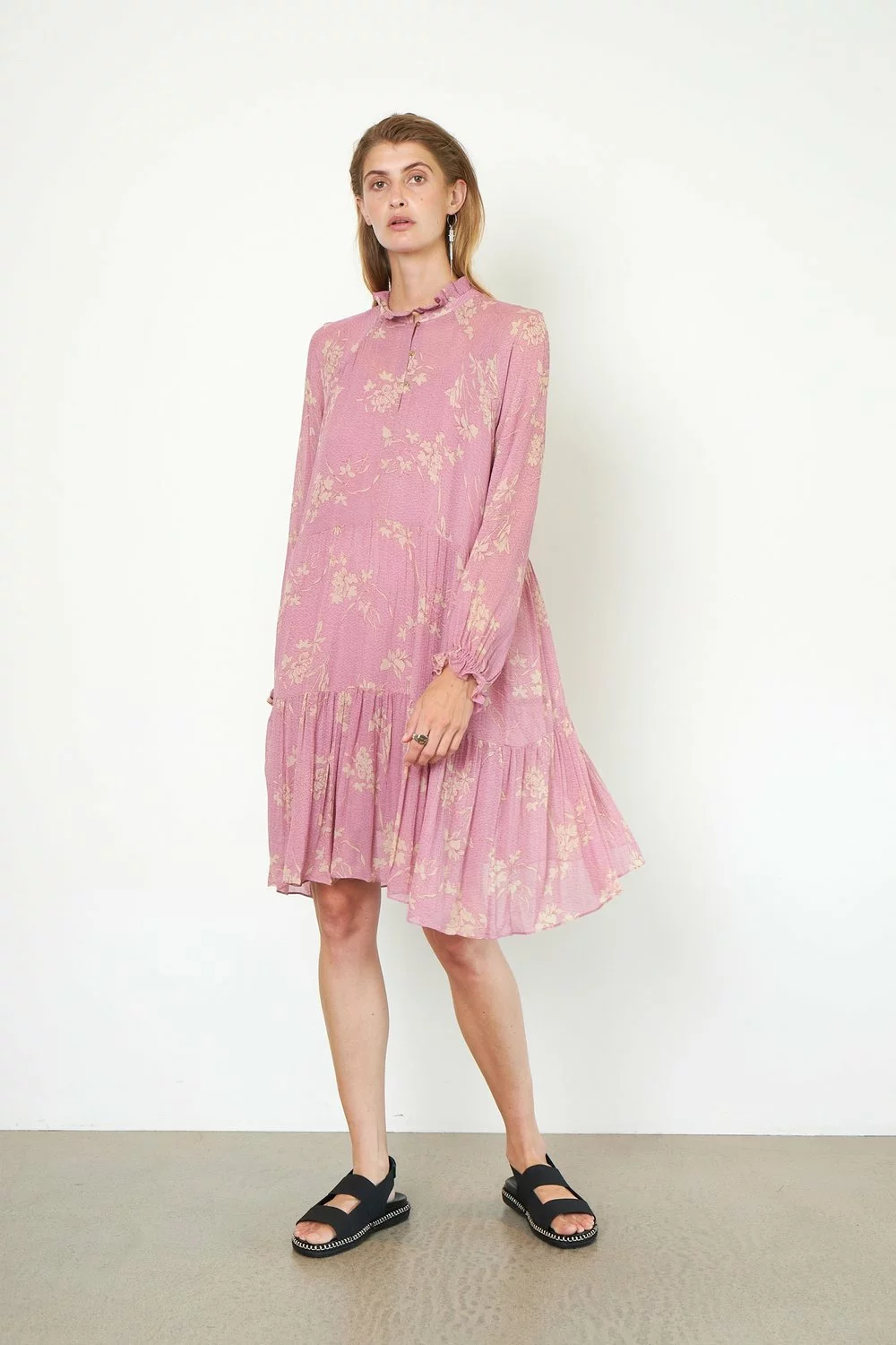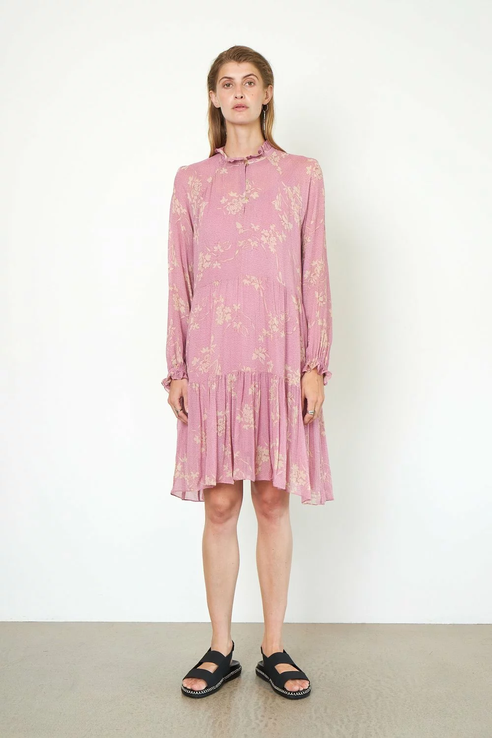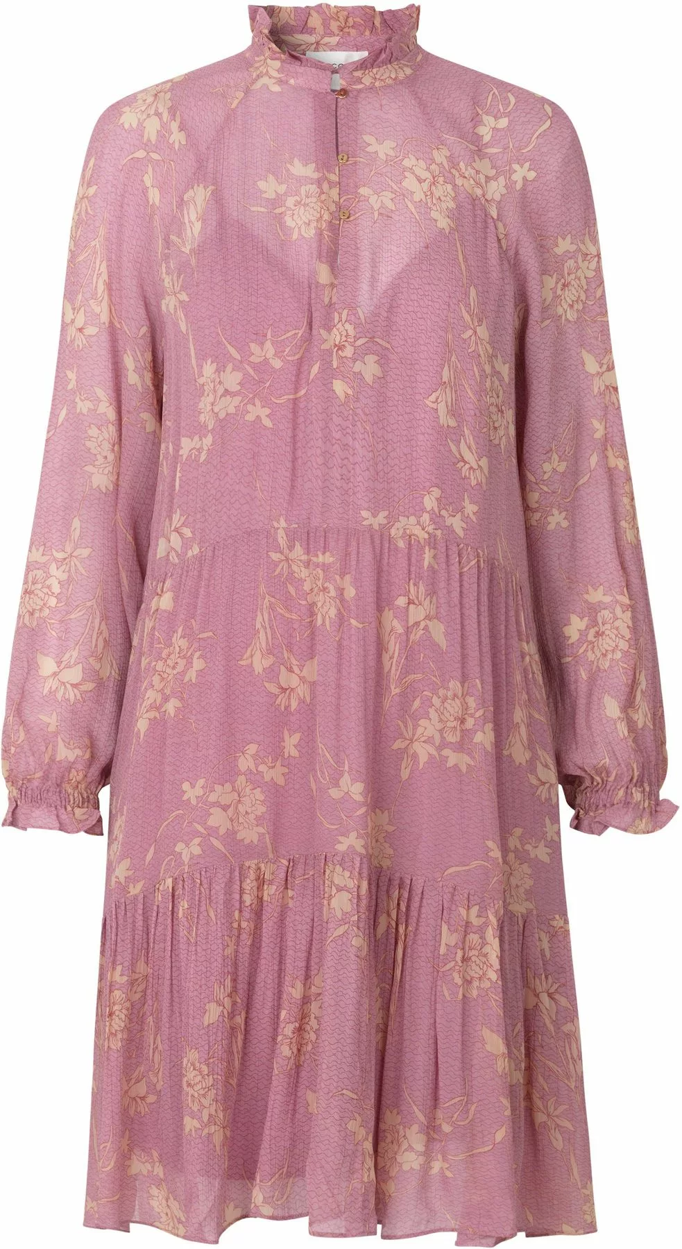 Mories Dress fra Second Female. Denne blomstertrykte kjolen er laget i lett og delikat viskosekvalitet. Kjolen har klassisk krage med frills og åpning foran med gyldne knapper. Den har flytende, lagdelt skjørtdel og voluminøse raglan-ermer med elastisk mansjett og frills.