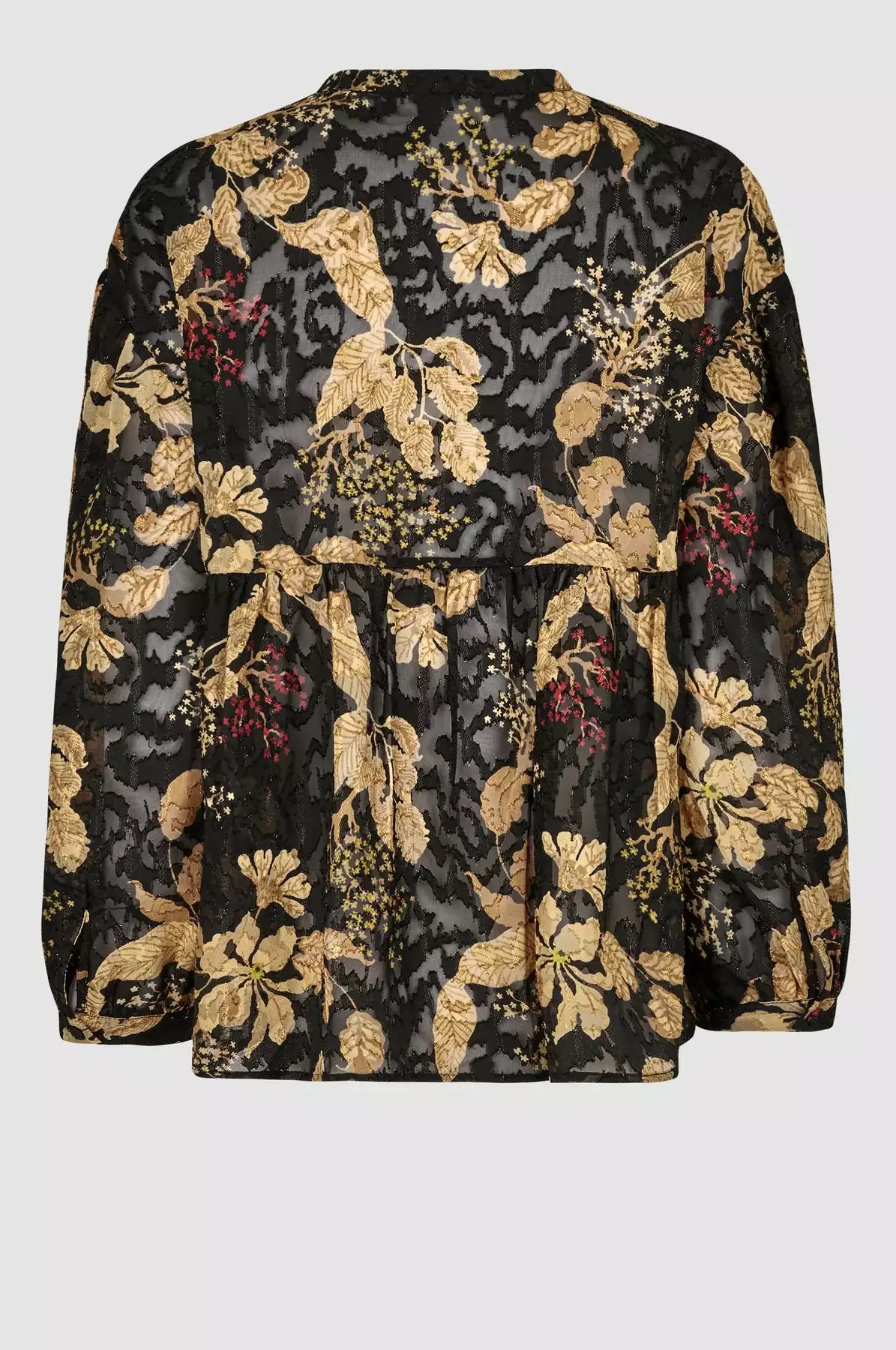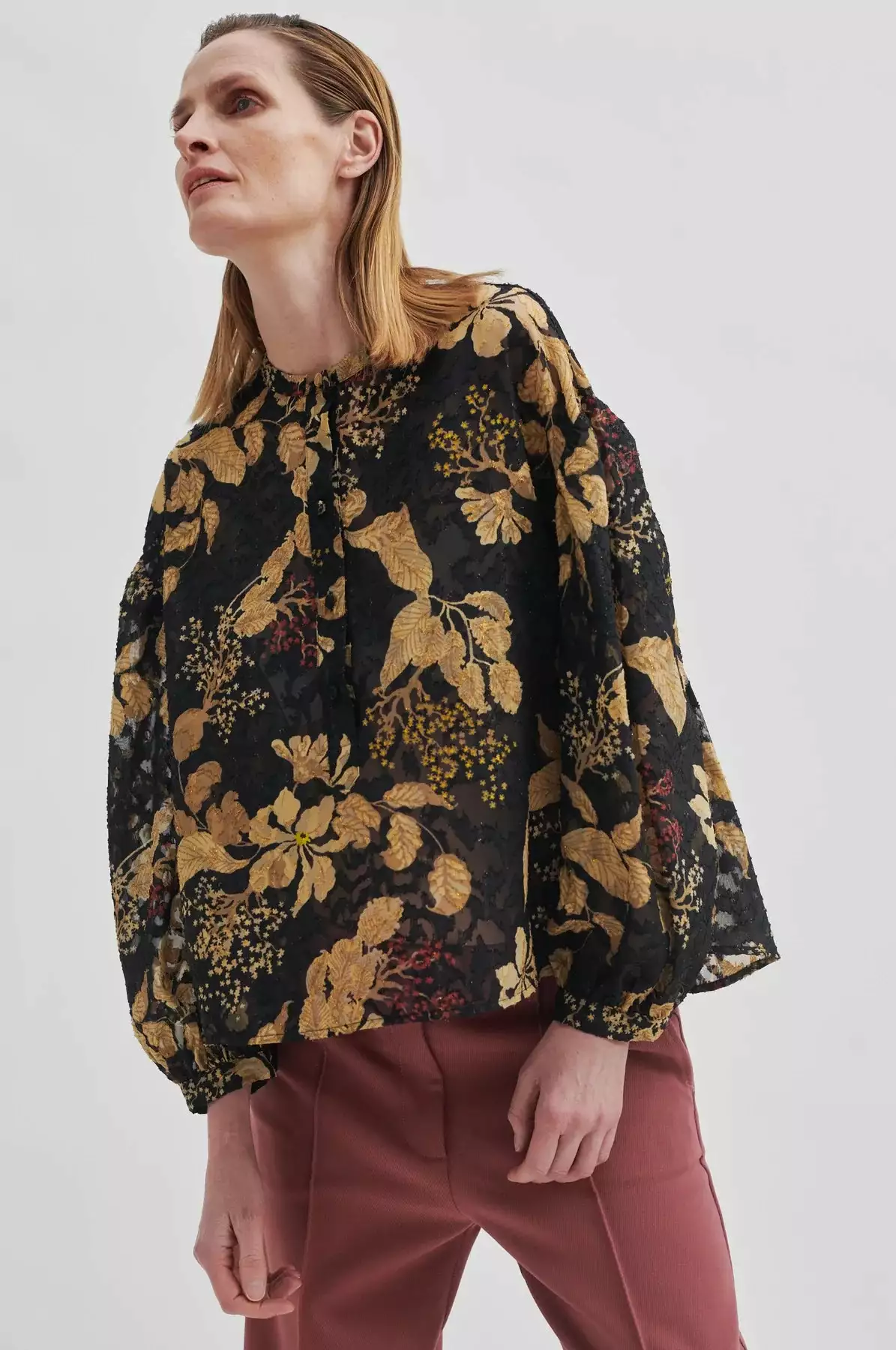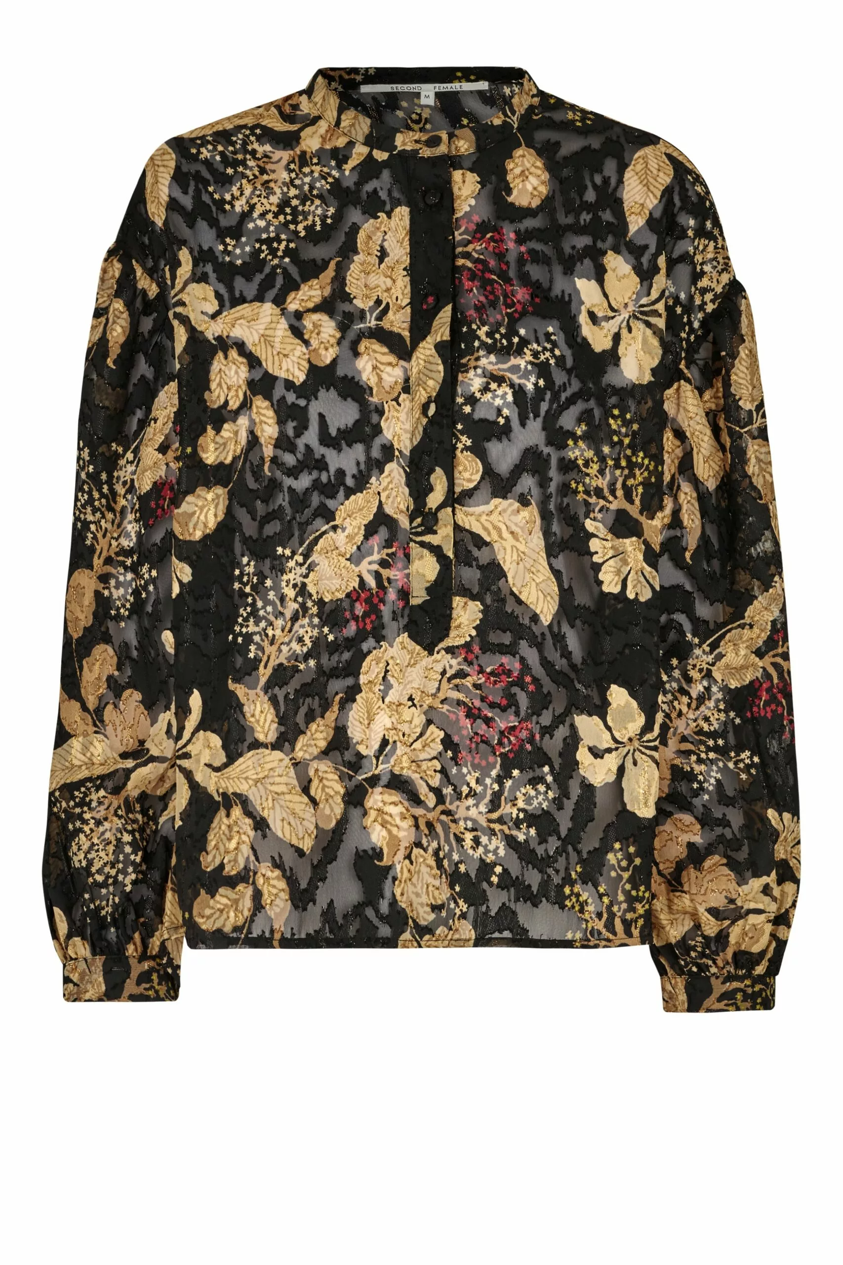 Mystery Blouse fra Second Female. En superfin bluse fra Second Female med et vakkert blomsterprint i gyldne toner med rød detaljer. Mystery Blouse er laget i semi-transparent stoff med blomstermønster og subtile, glitrende lurex-tråder med en skjult halv knappestolpe og liten stående krage. Blusen lange ermer med lav skuldersøm og mansjetter med knapp. Søm midt på ryggen med små rynker som skaper ekstra volum. Løs passform.