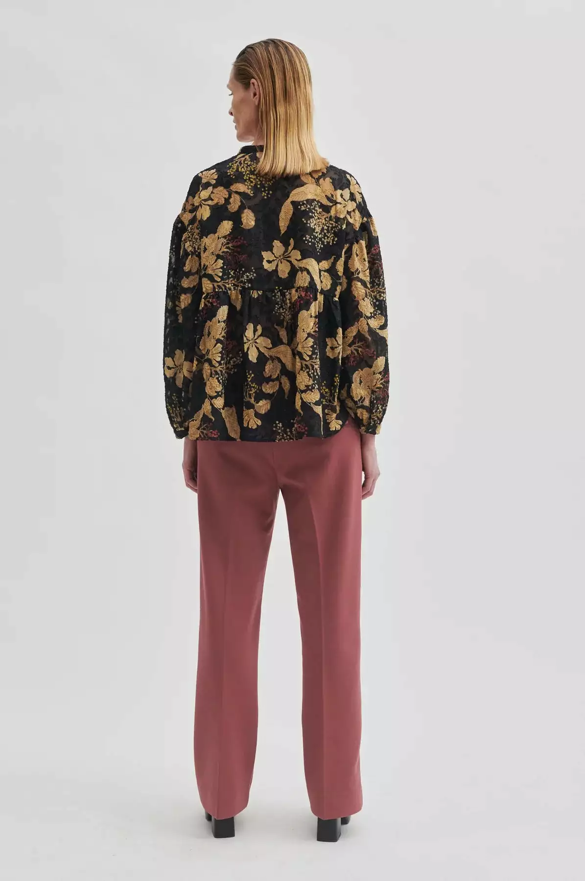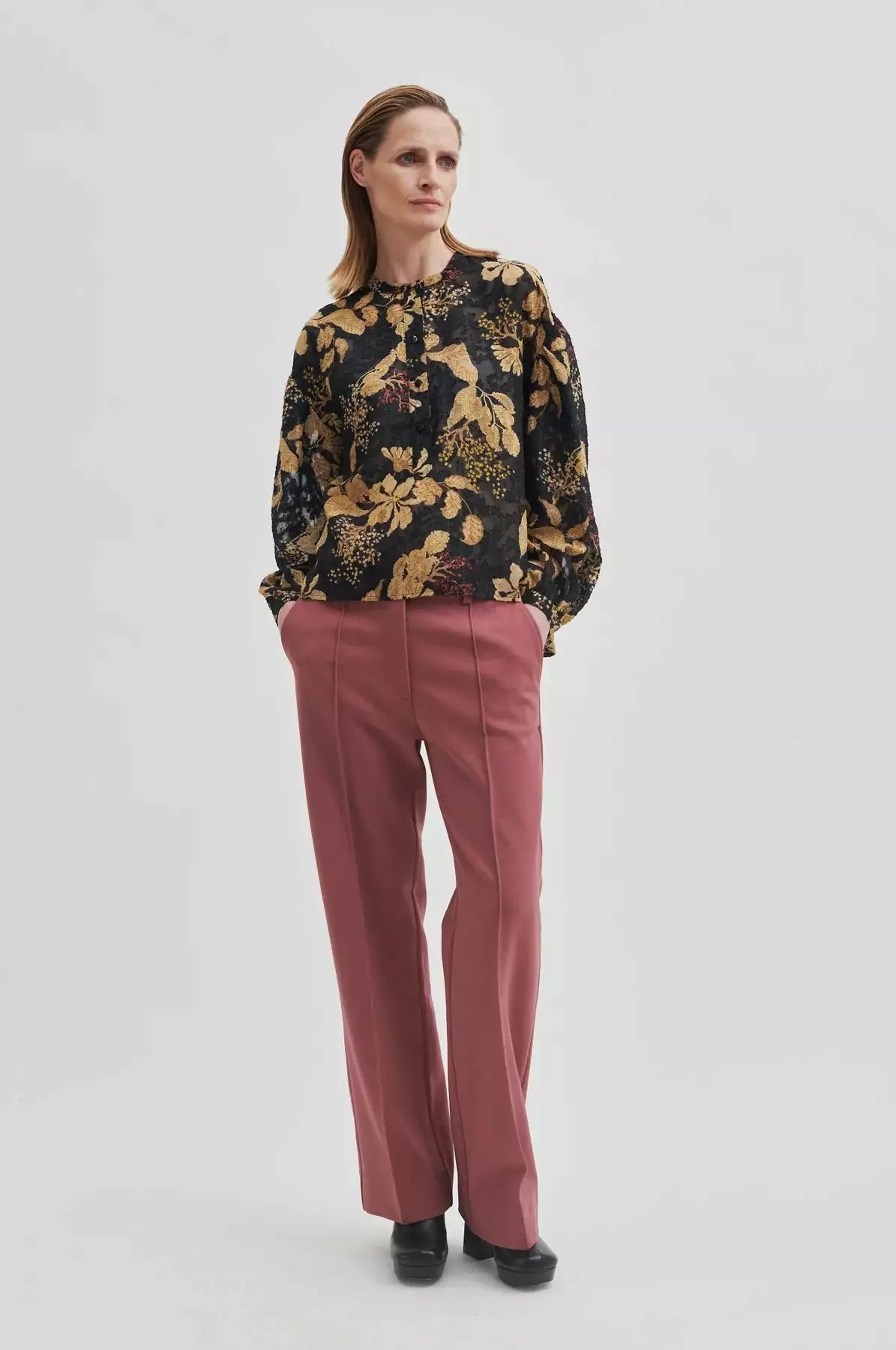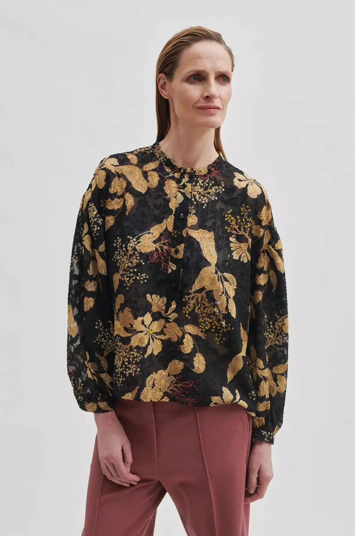 Mystery Blouse fra Second Female. En superfin bluse fra Second Female med et vakkert blomsterprint i gyldne toner med rød detaljer. Mystery Blouse er laget i semi-transparent stoff med blomstermønster og subtile, glitrende lurex-tråder med en skjult halv knappestolpe og liten stående krage. Blusen lange ermer med lav skuldersøm og mansjetter med knapp. Søm midt på ryggen med små rynker som skaper ekstra volum. Løs passform.