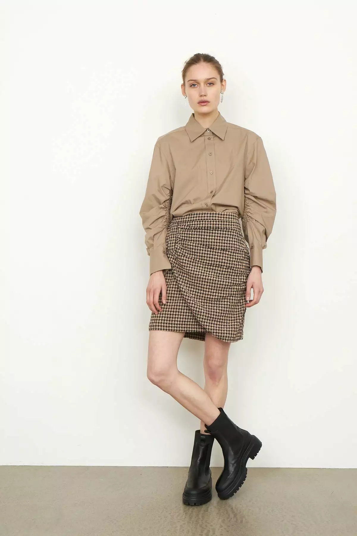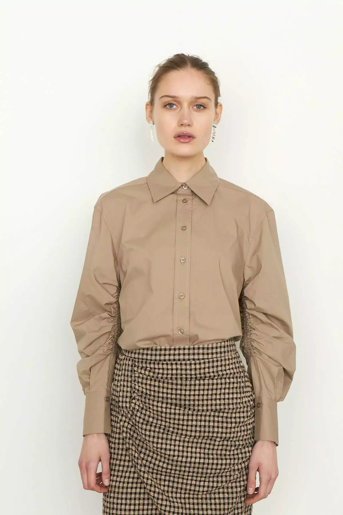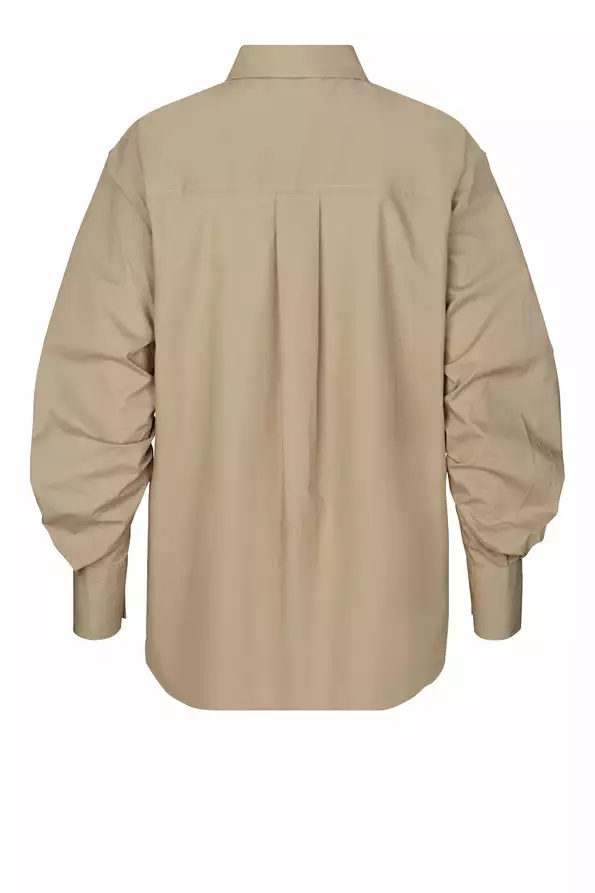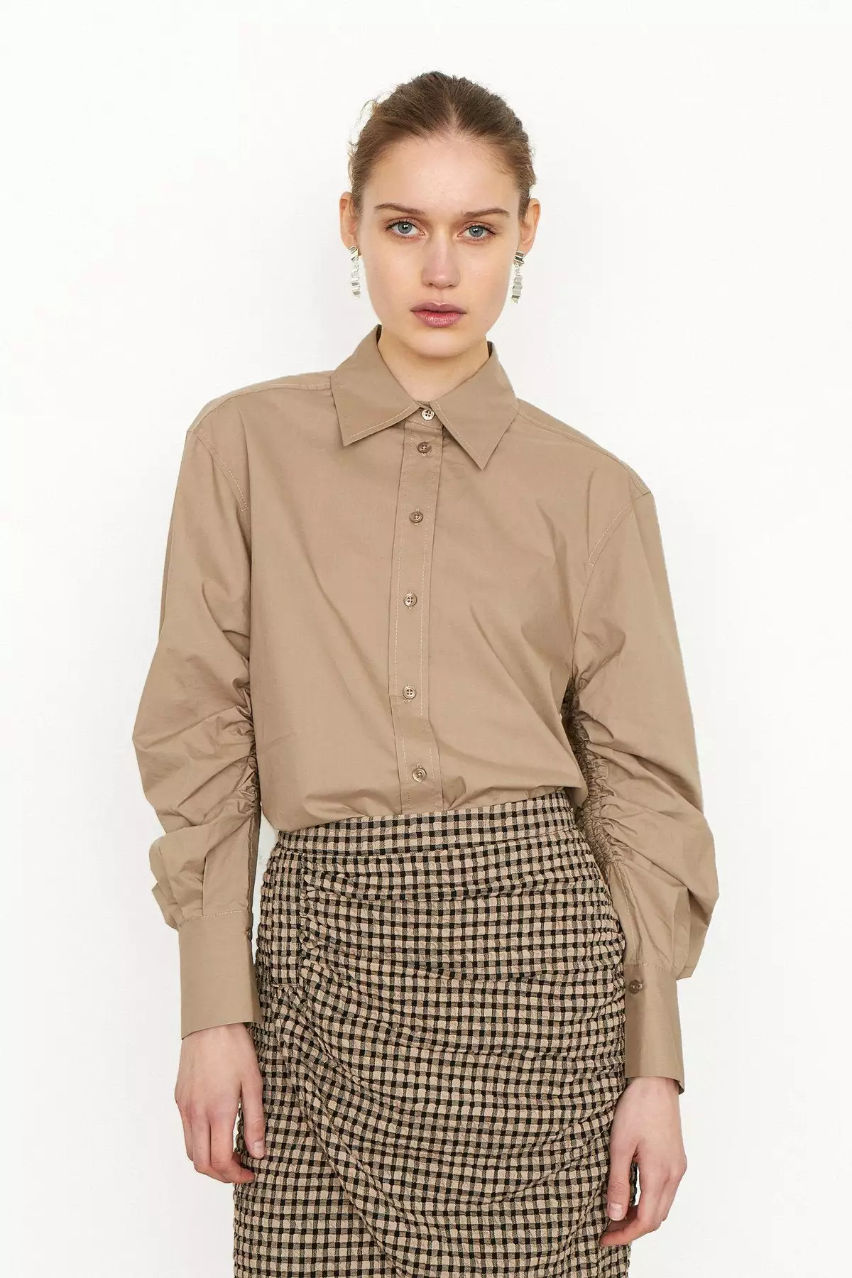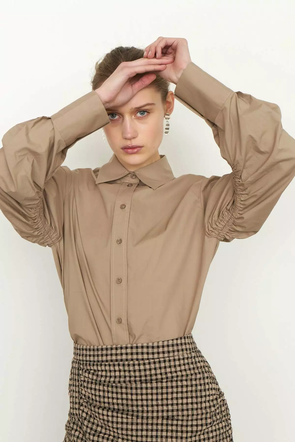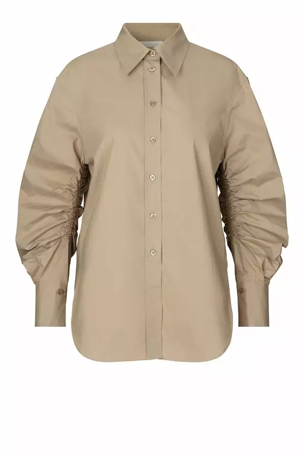 Phoebe Detail Shirt fra Second Female. En stilig statement-skjorte laget i 100% bomullskvalitet. Skjorten har klassisk skjortekrage og knapp gjennom åpningen foran. Skjorten har unike samlinger med elastikk på innsiden av ermene for å skape et statement -utseende. Skjorten har vanlig passform. Kombiner den med et av våre korte miniskjørt for en chic look!