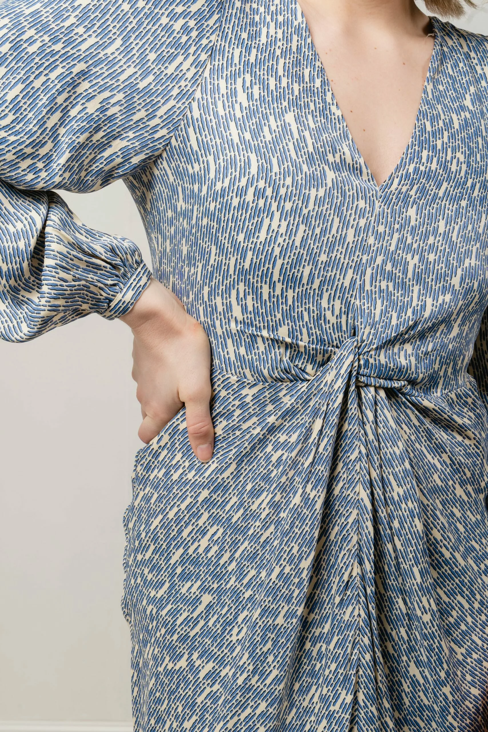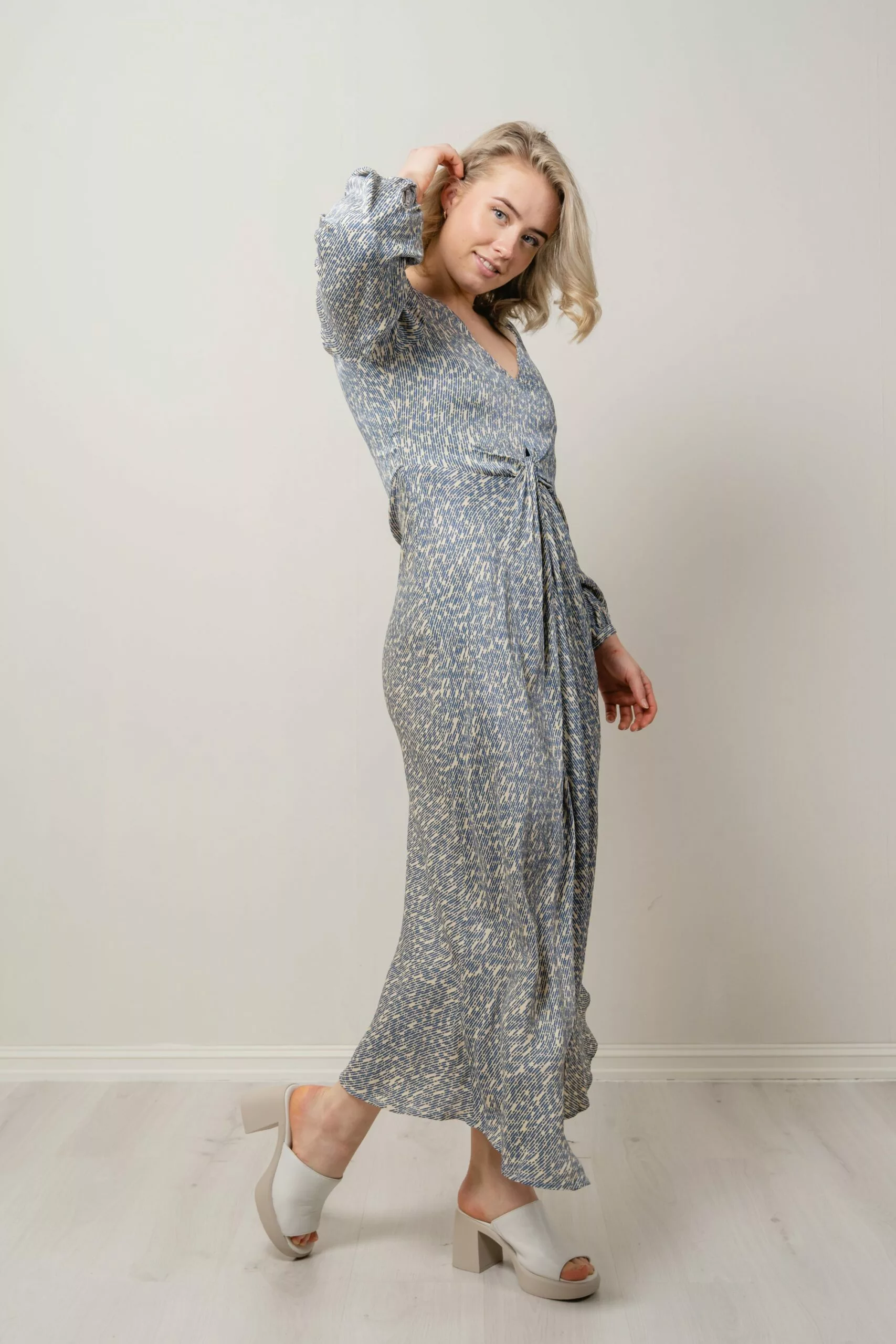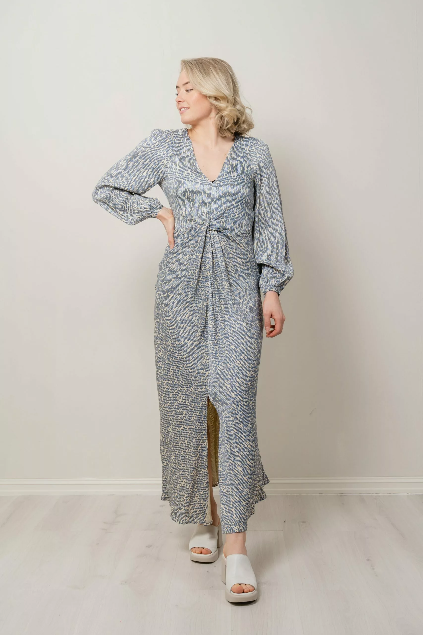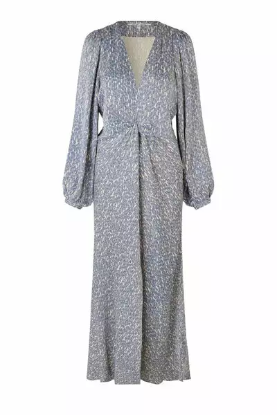maxi lengde med snittlinje med dekorativ knute i midjen og høy splitt midt foran på skjørte. Kjolen har lange ballongermer med smale mansjetter og V-hals. Like fin i bryllup med høye heler, som på sommerferie med flate sandaler.