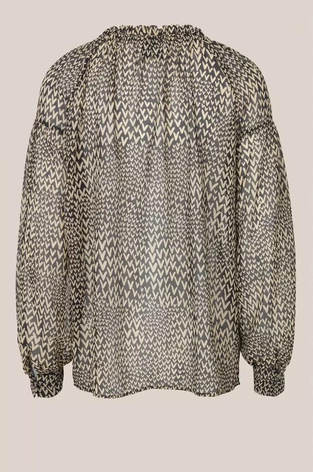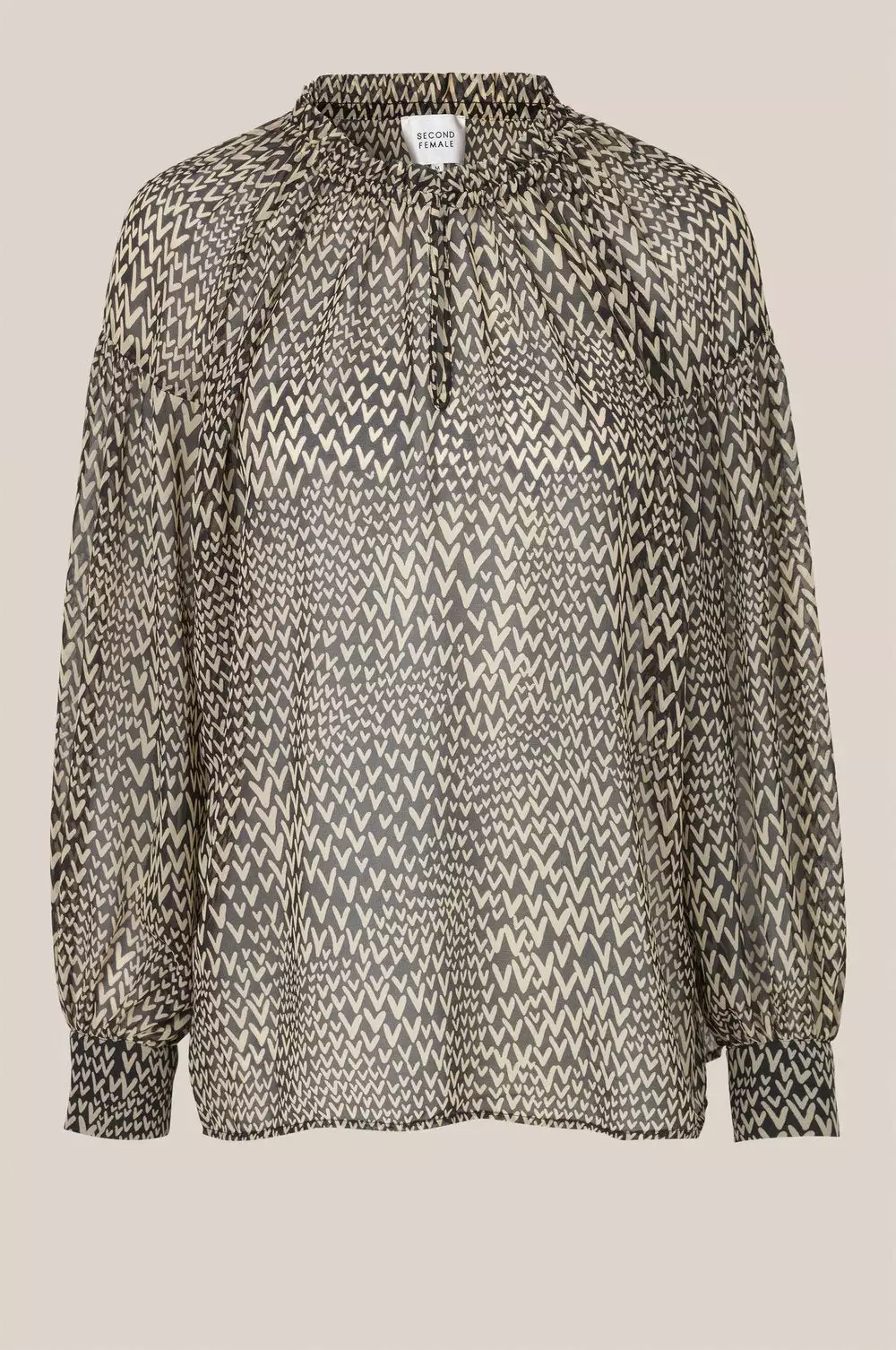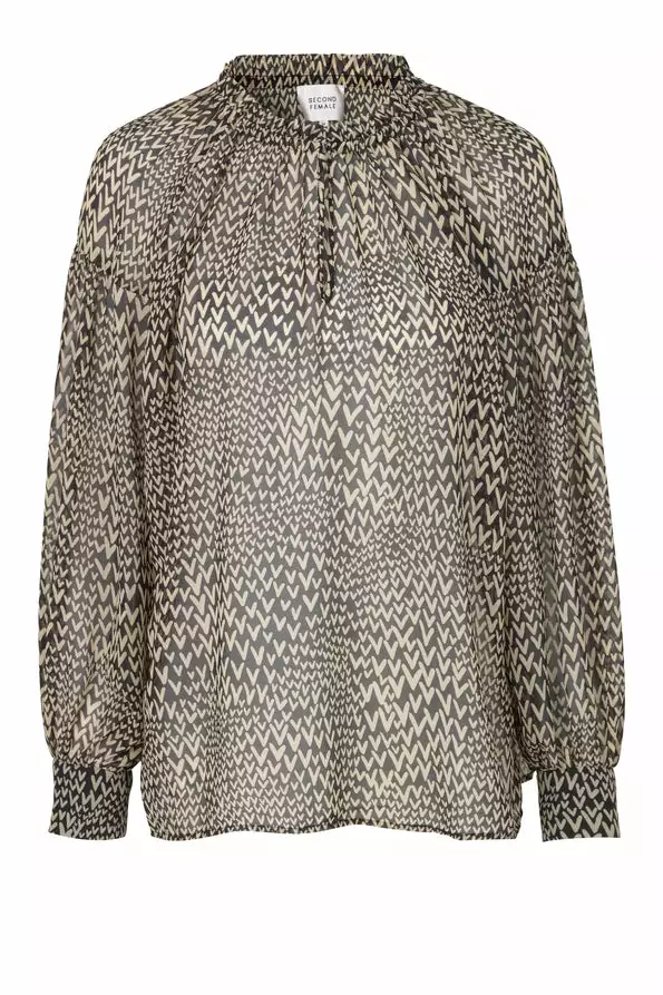 Søt bluse med print fra Second Female. Litt gjennomsiktig stoff. Åpen høy hals med mulighet for å lukke med knapp. Skjorten har lav skuldre og vide ermer.