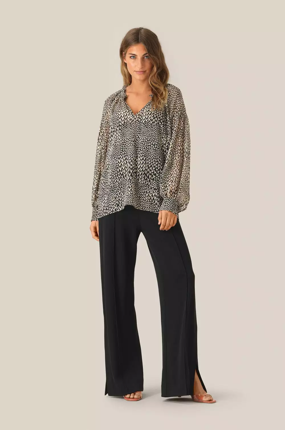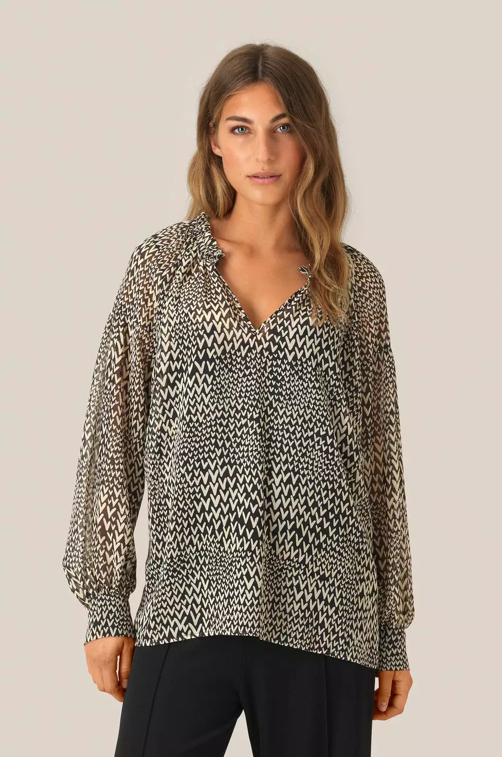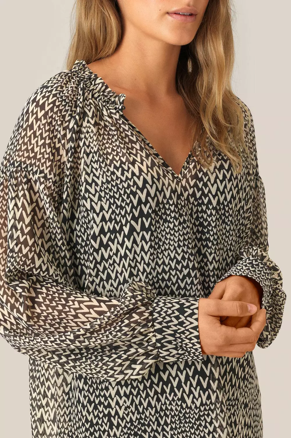 Søt bluse med print fra Second Female. Litt gjennomsiktig stoff. Åpen høy hals med mulighet for å lukke med knapp. Skjorten har lav skuldre og vide ermer.