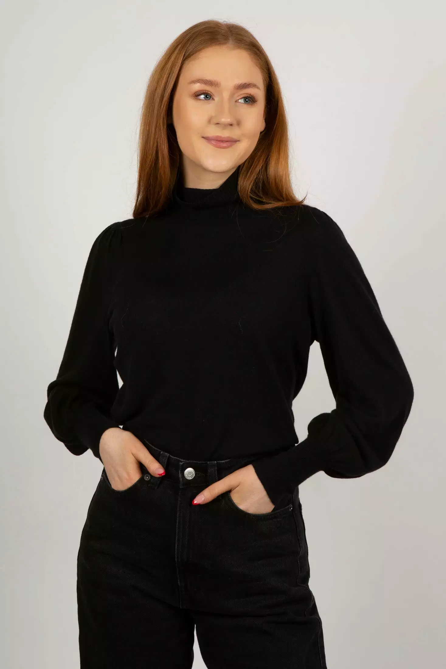 Rosie T-Neck fra Second Female. Superfin høyhalset genser, med lekre ballongermer. Stretch i stoffet, og en figurnær passform. Bruk den med en lekker dressbukse eller et skjørt, og den er perfekt under en deilig strikkvest.