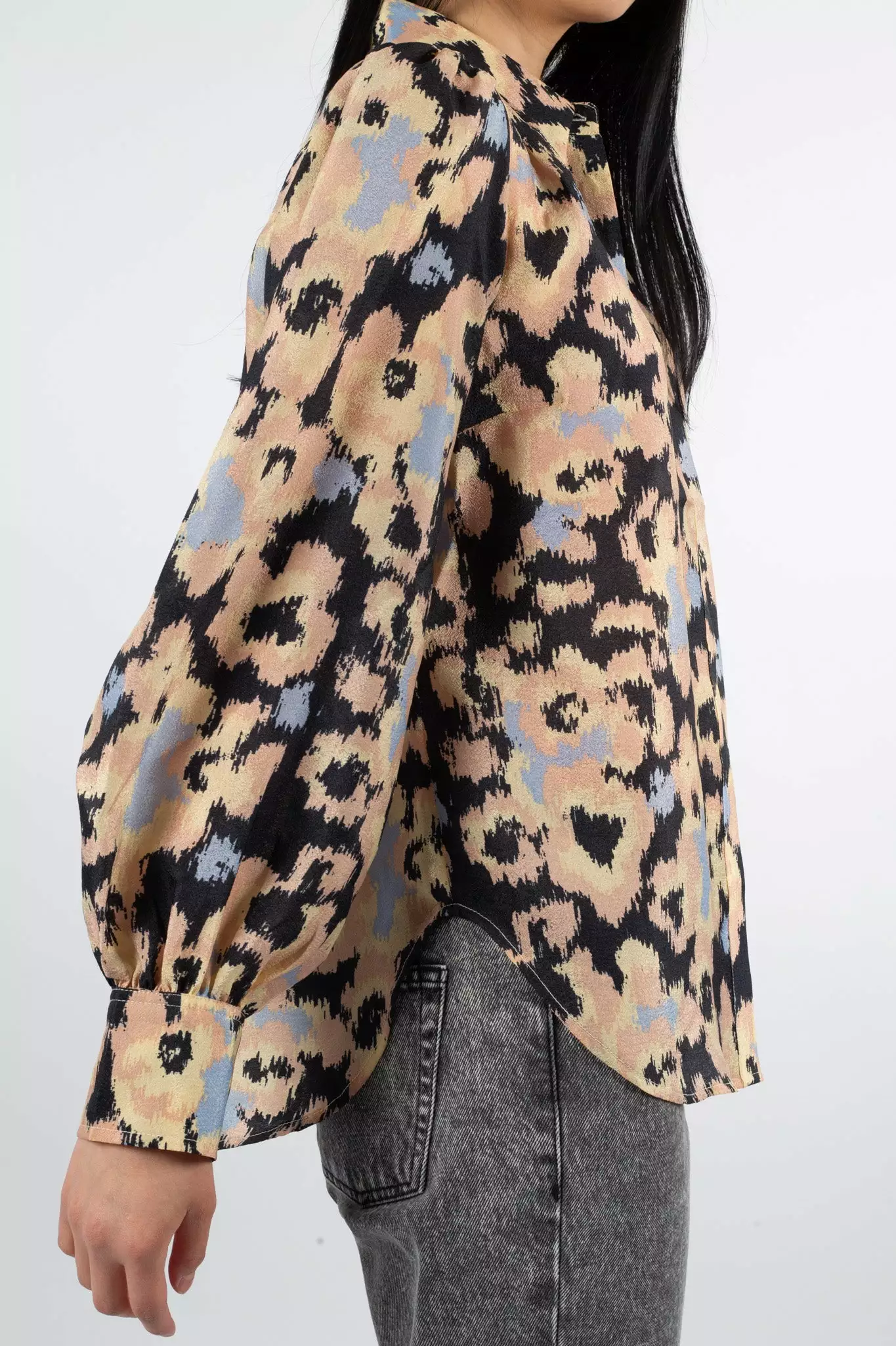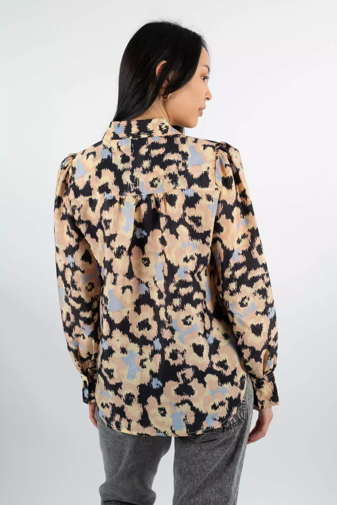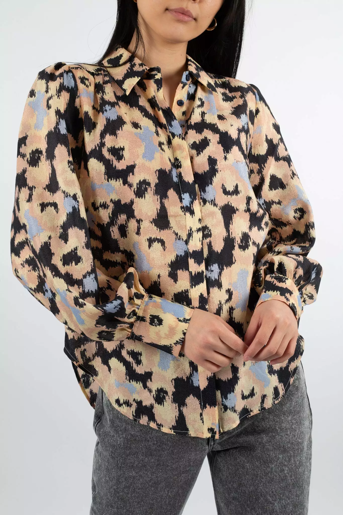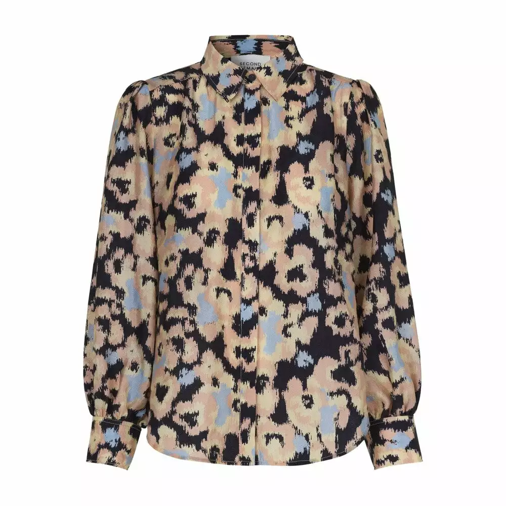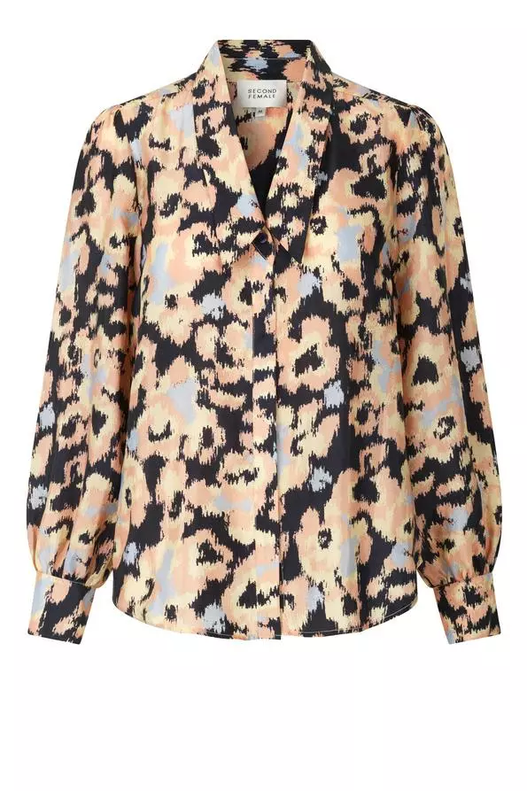 Ruth Shirt fra Second Female. Denne trykte, feminine skjorten er laget i en resirkulert blandingskvalitet i polyester. Skjorten har en lang krage og skjult knapp gjennom åpningen foran. Den har samlinger ved skulderen for omfangsrike ermer og klassisk mansjett.