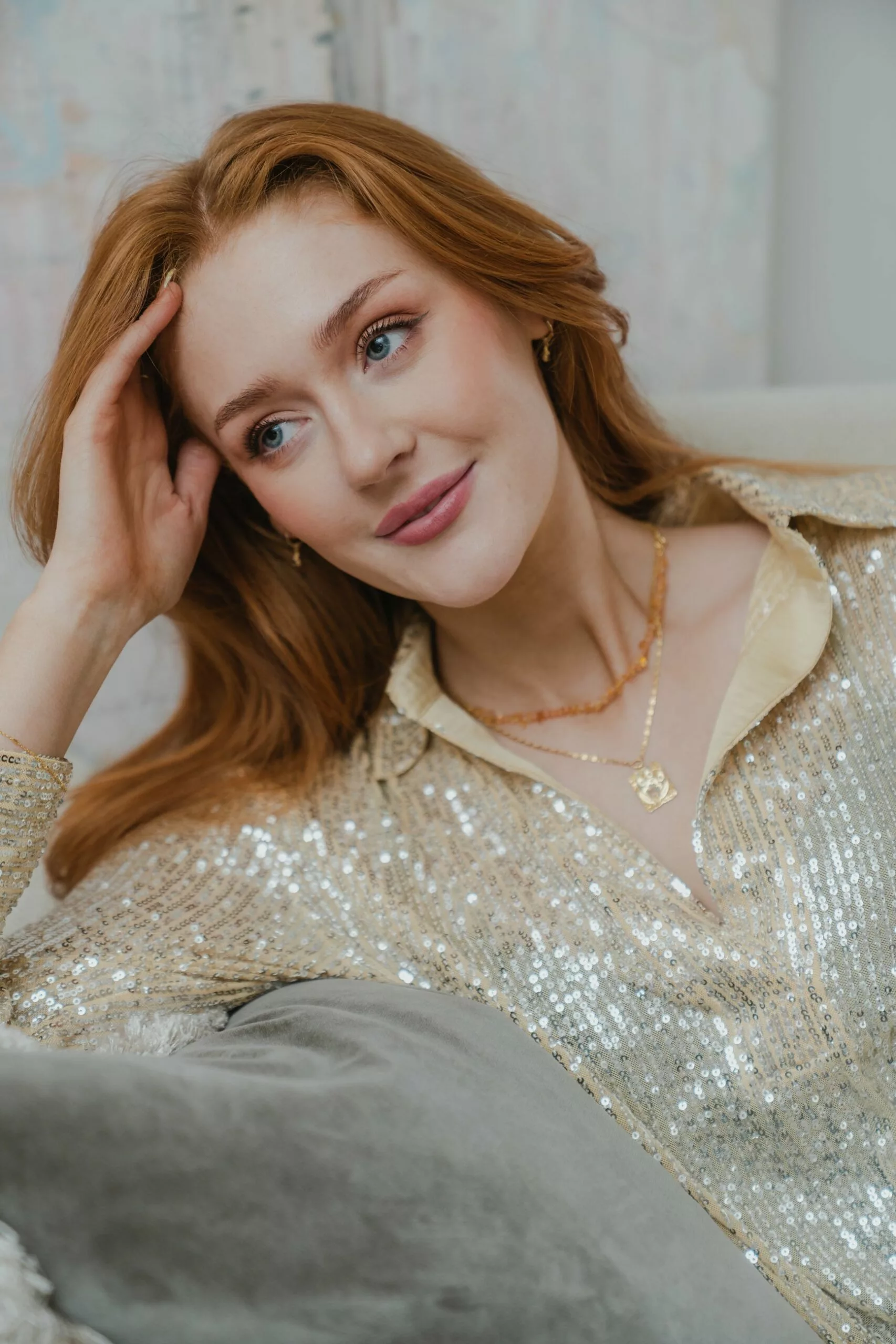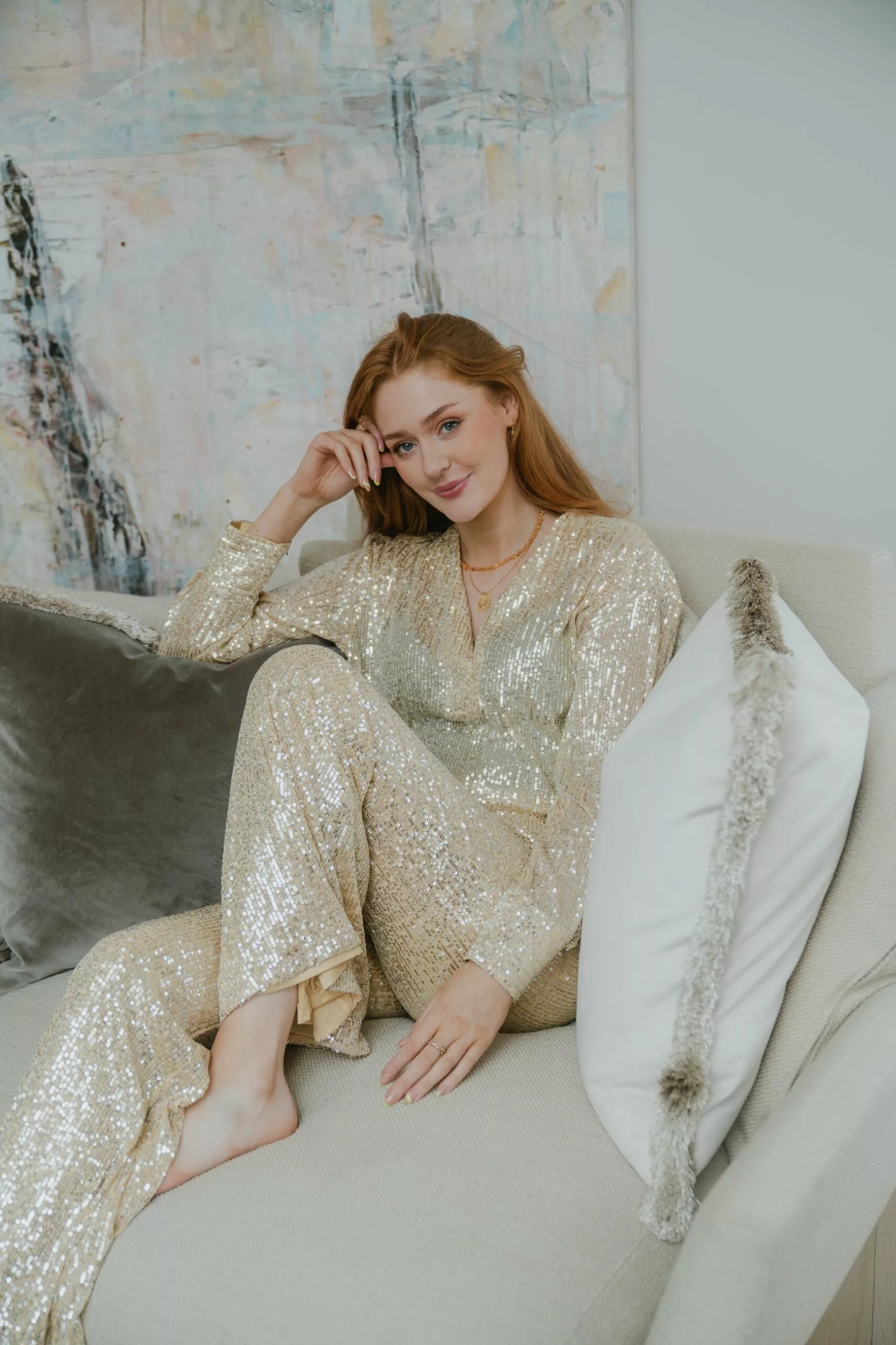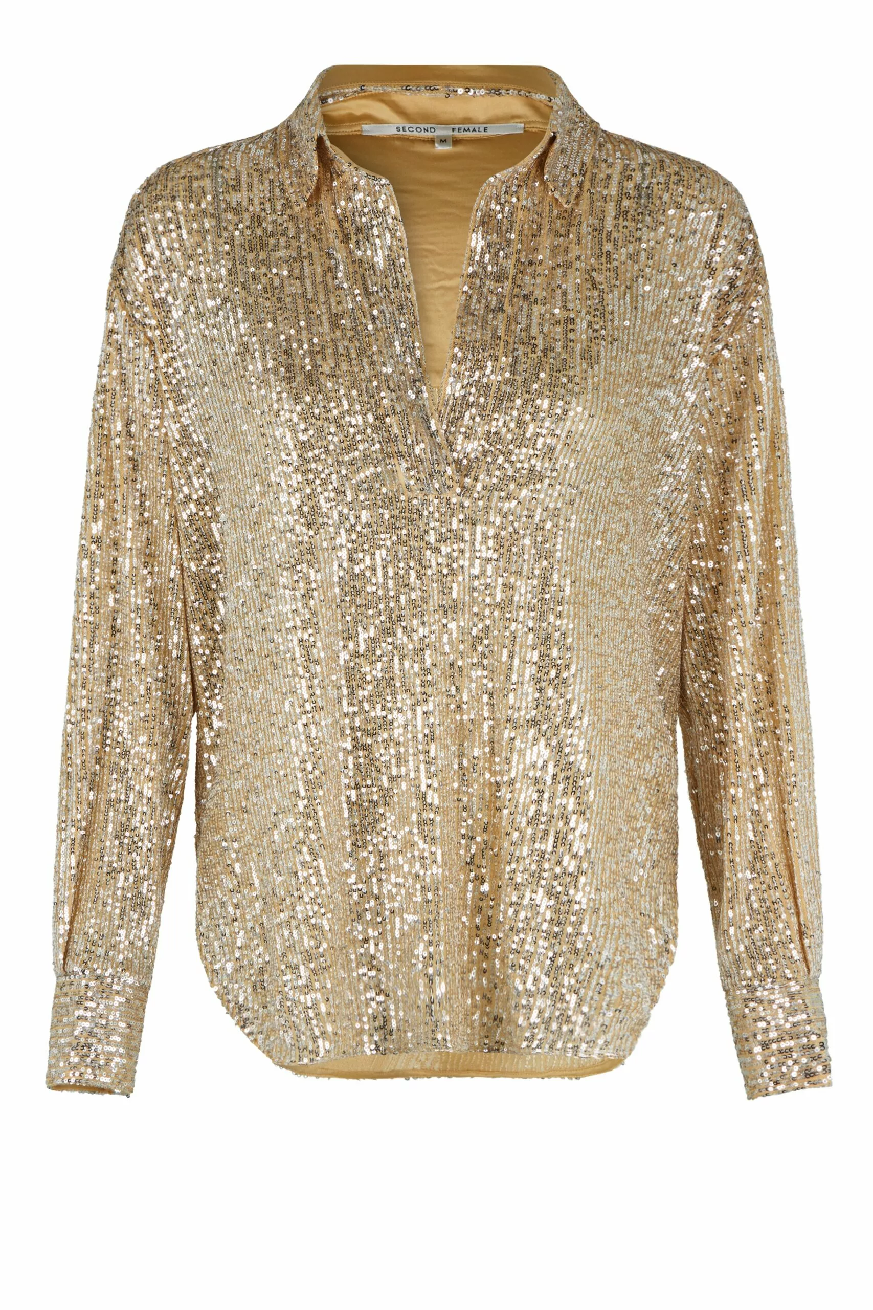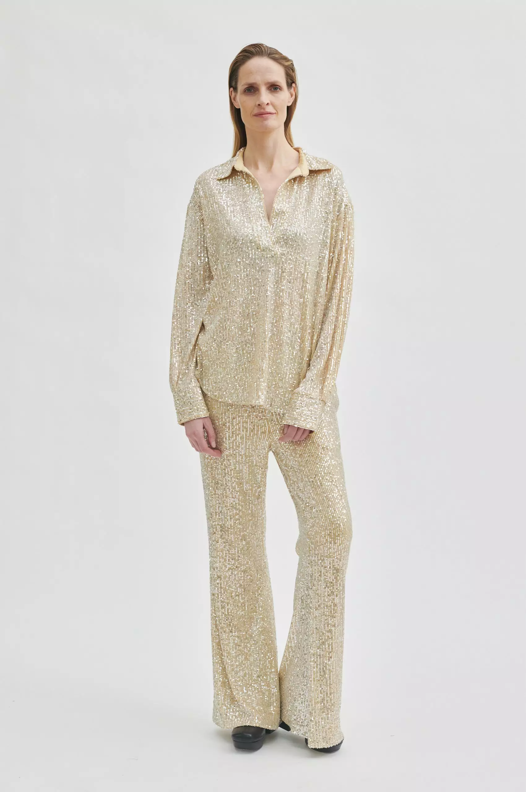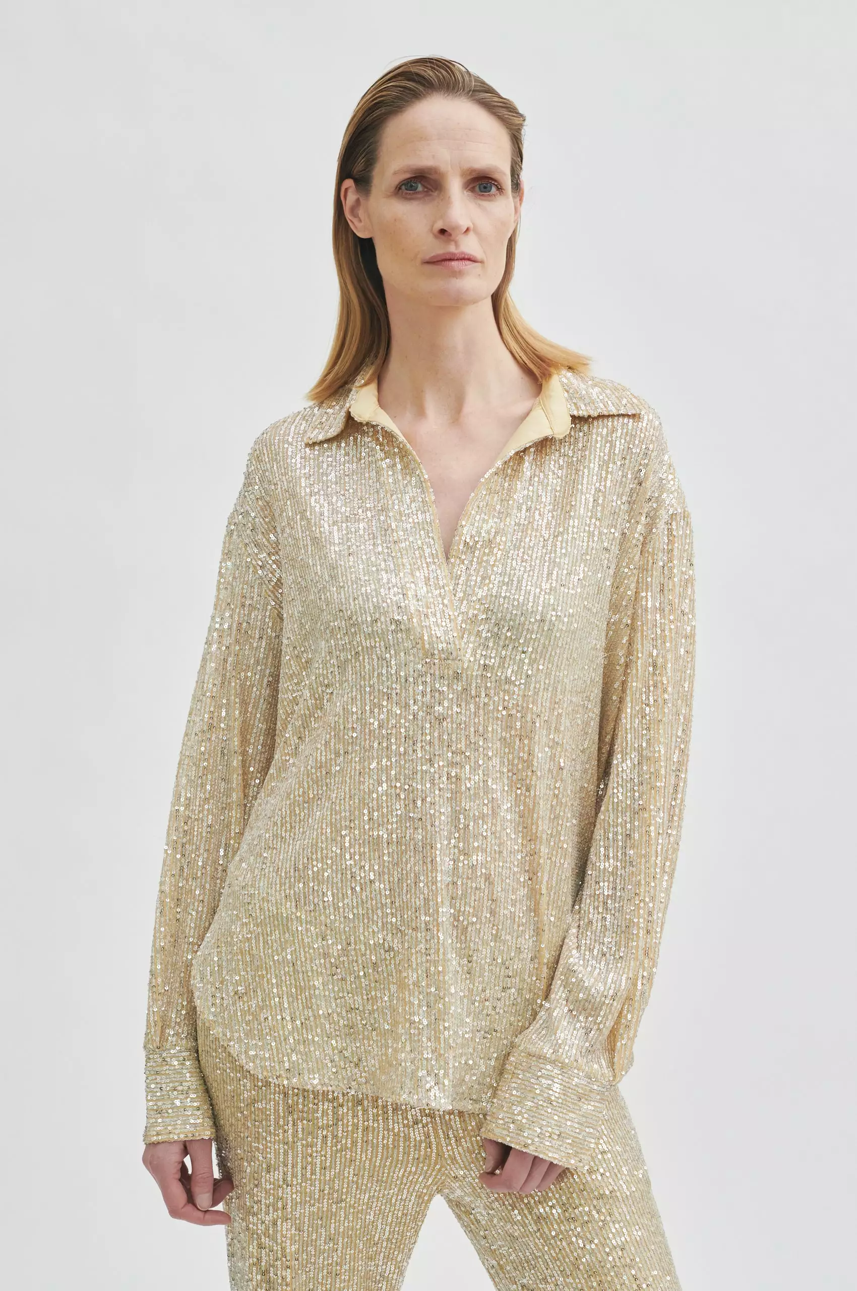 Shine On Blouse fra Second Female. Møt partysesongen med den kuleste blusen – Shine On Blouse. Shine On Blouse har klassiske detaljer som en rett passform, lange ermer med mansjett, skjortekrage og V-hals. Blusen kommer i et superkult paljettstoff som gjør at du vil skinne på alle høsten og vinterens fester. Style gjerne blusen med Shine On Trousers for en skikkelig partylook.