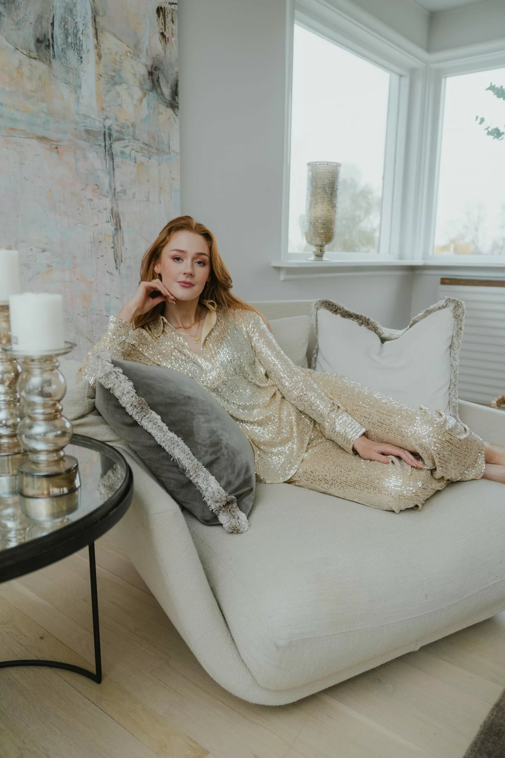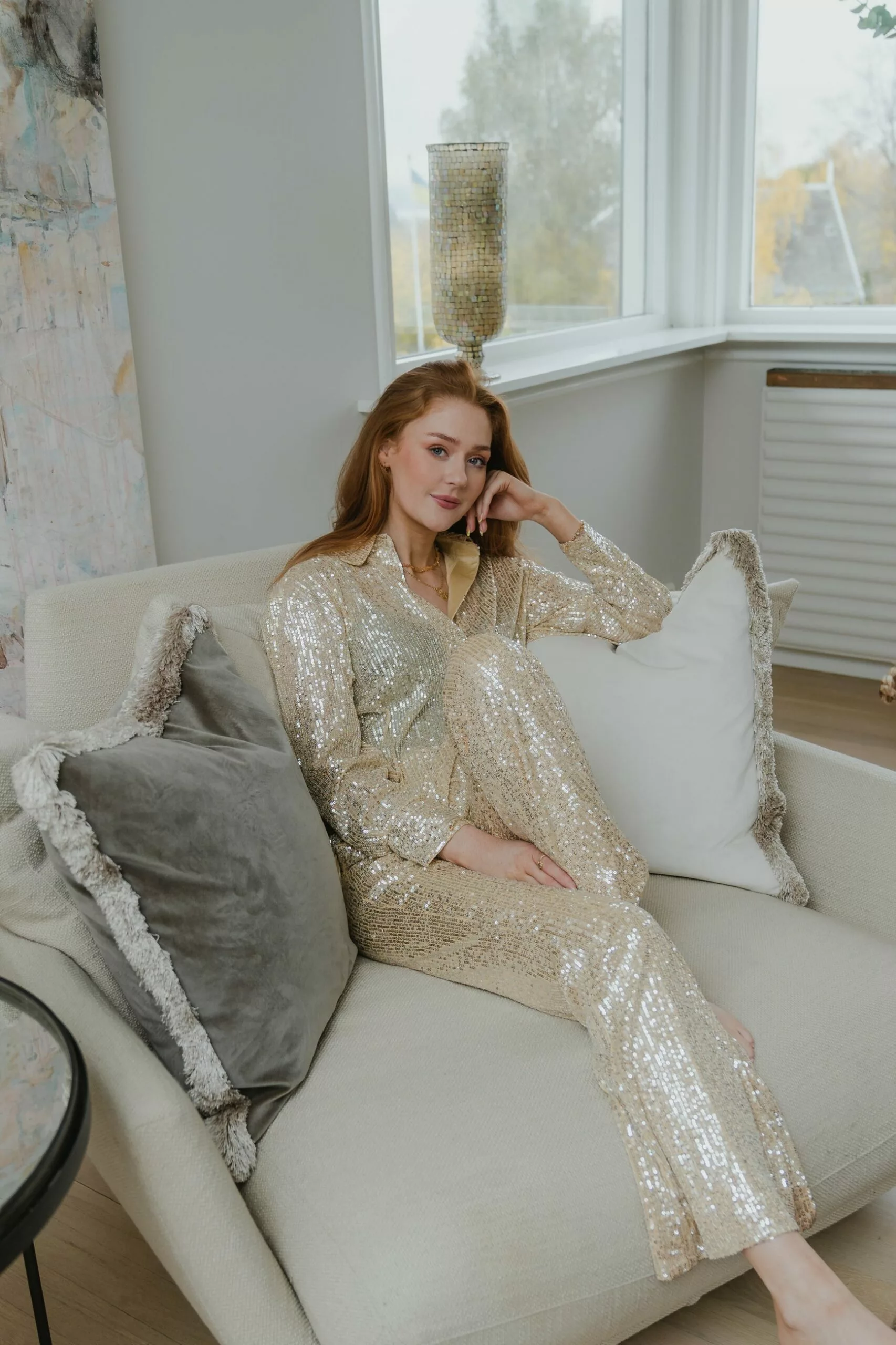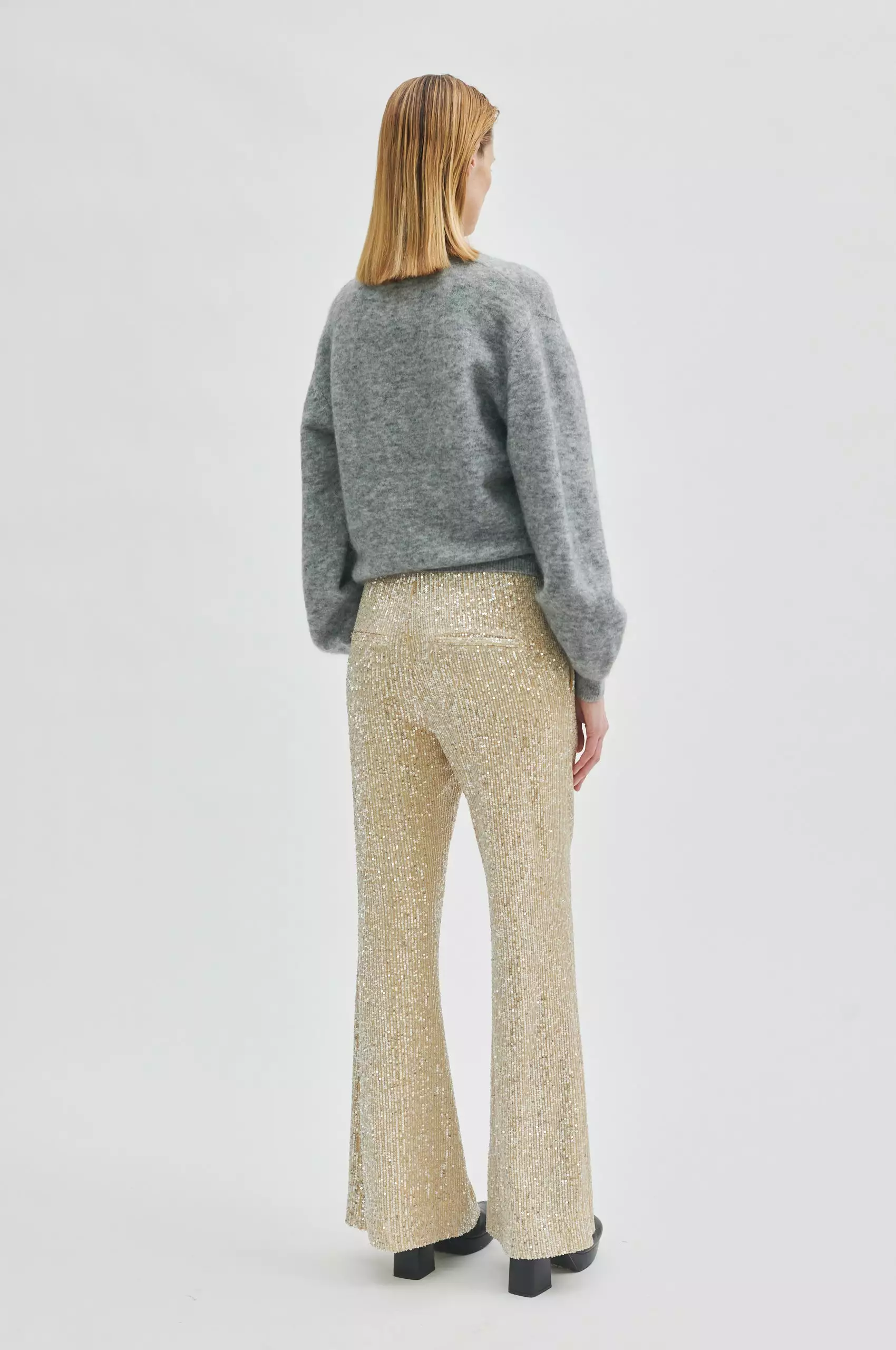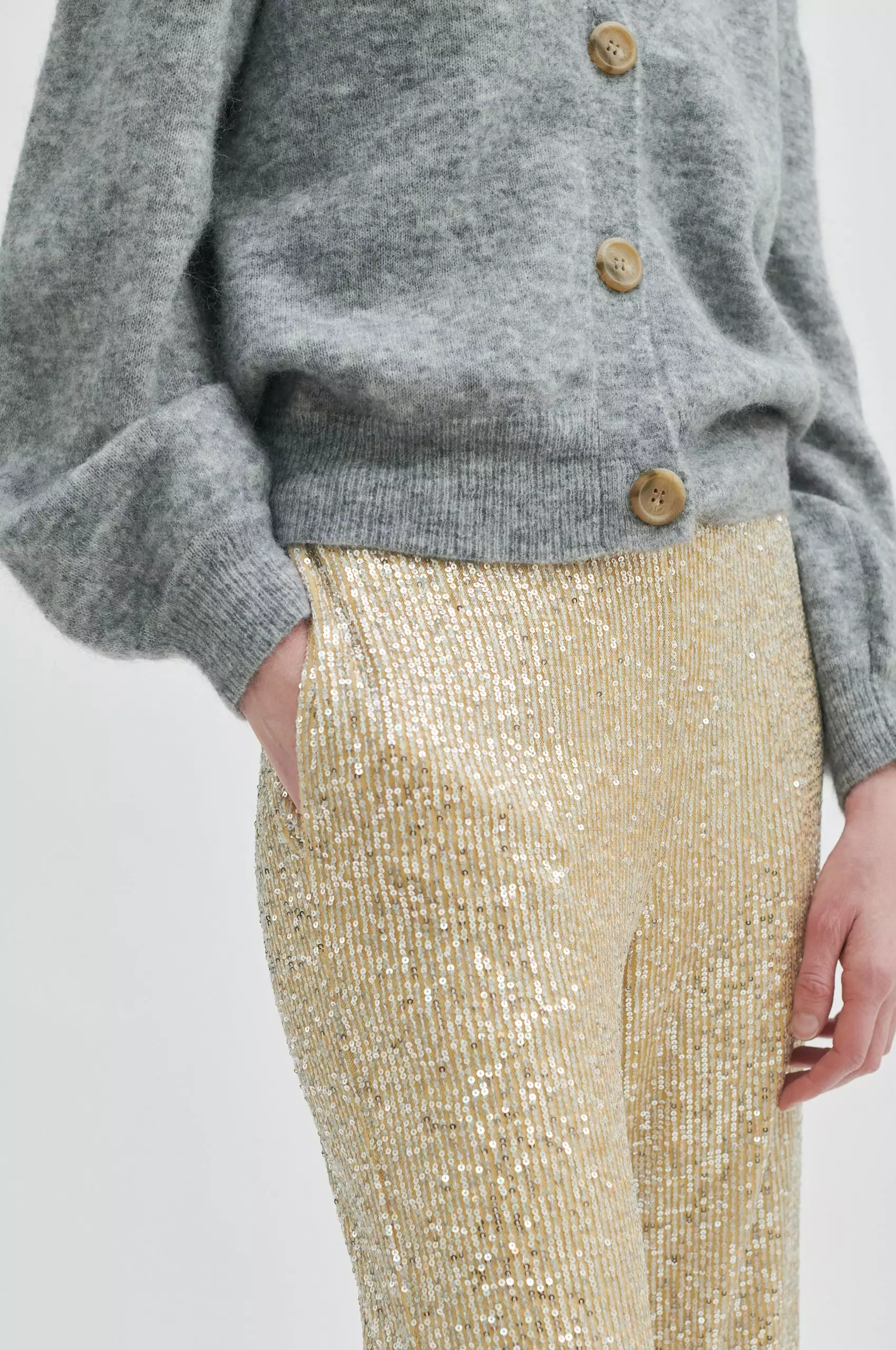 Shine On Trousers fra Second Female. Møt partysesongen med den kuleste buksen – Shine On Trousers. Shine On Trousers har en rett passform, lange, vide ben med lett sleng og lommer i sidene. Buksene kommer i et superkult paljettstoff som gjør at du vil skinne på alle høsten og vinterens fester. Style gjerne buksen med Shine On Blouse for en skikkelig partylook.