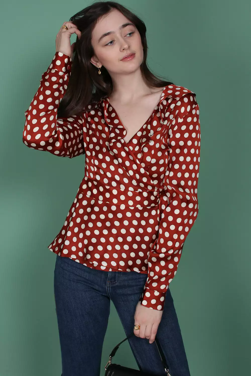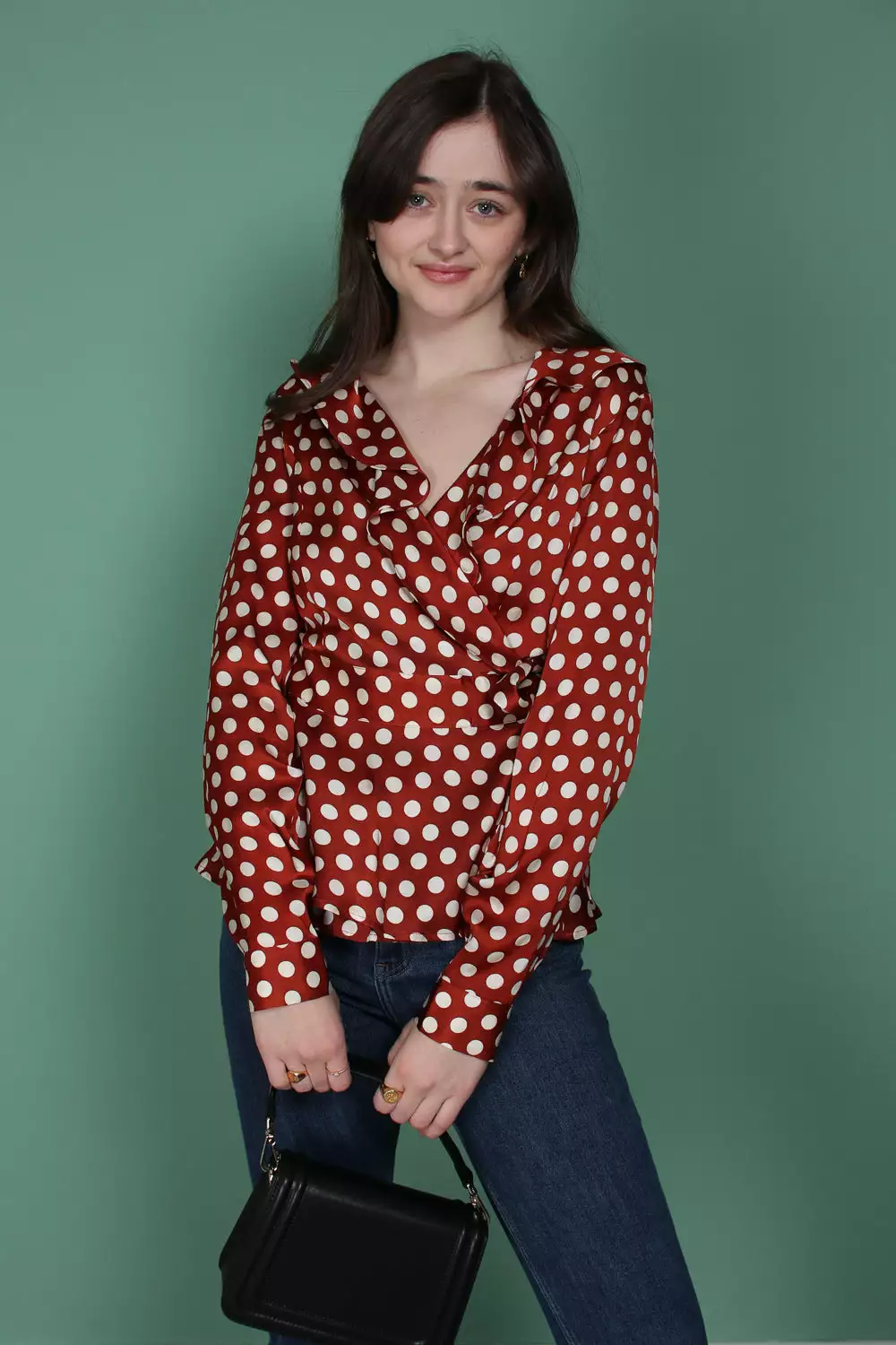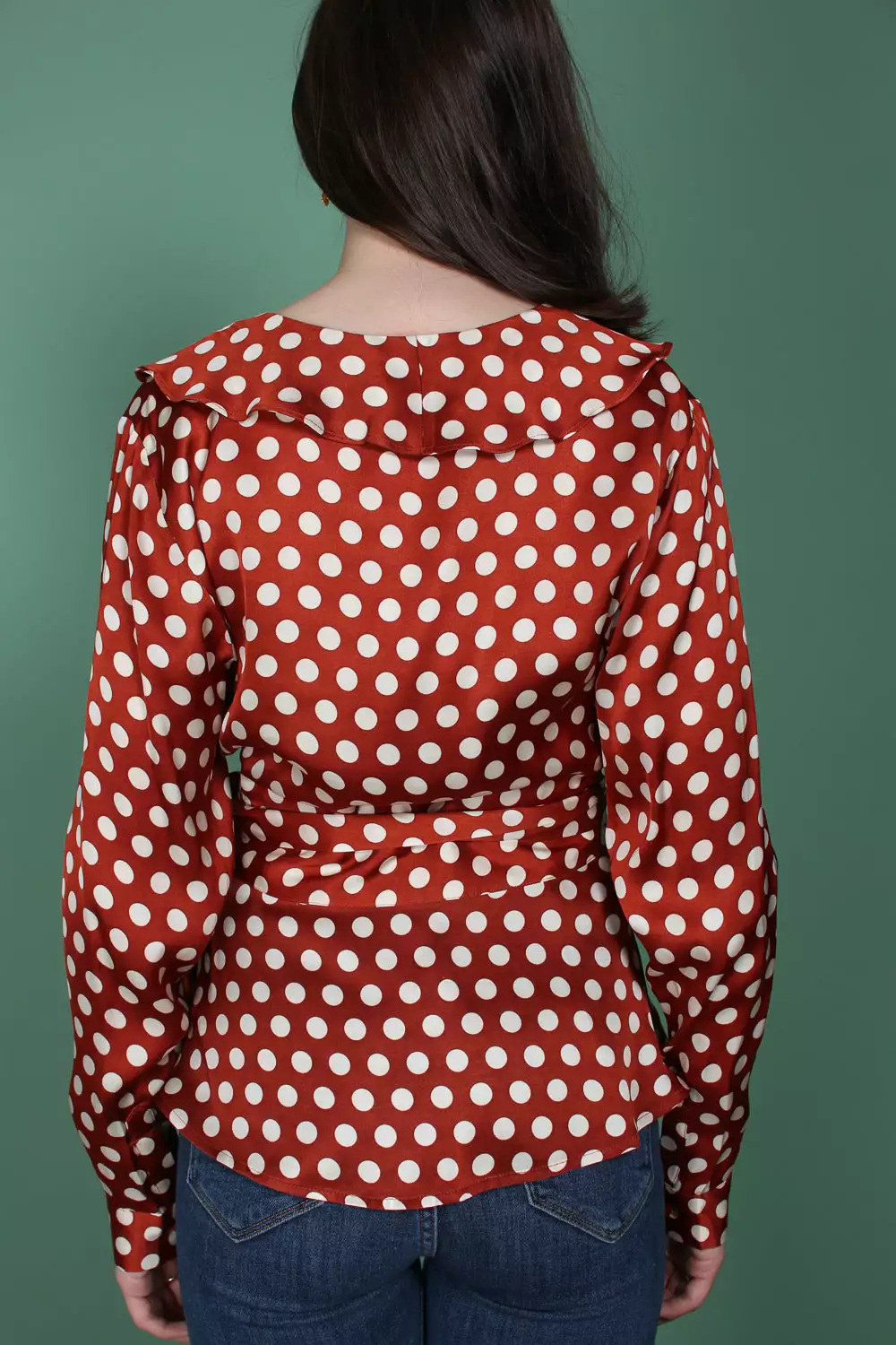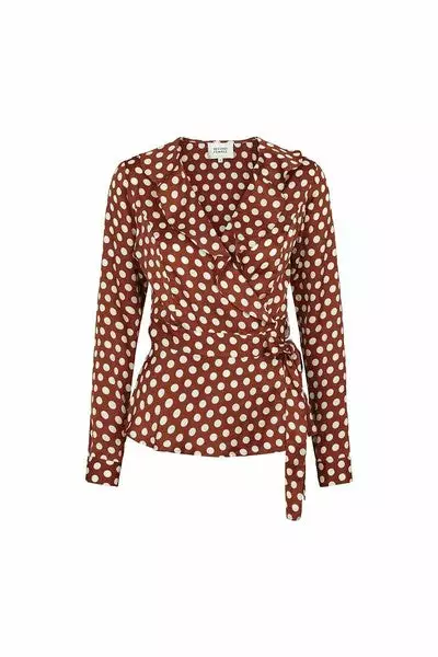 Wrapbluse med prikker på i brunt og hvitt. Volanger i kragen og utringningen med et feminint snitt.