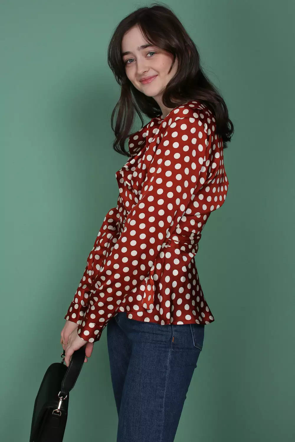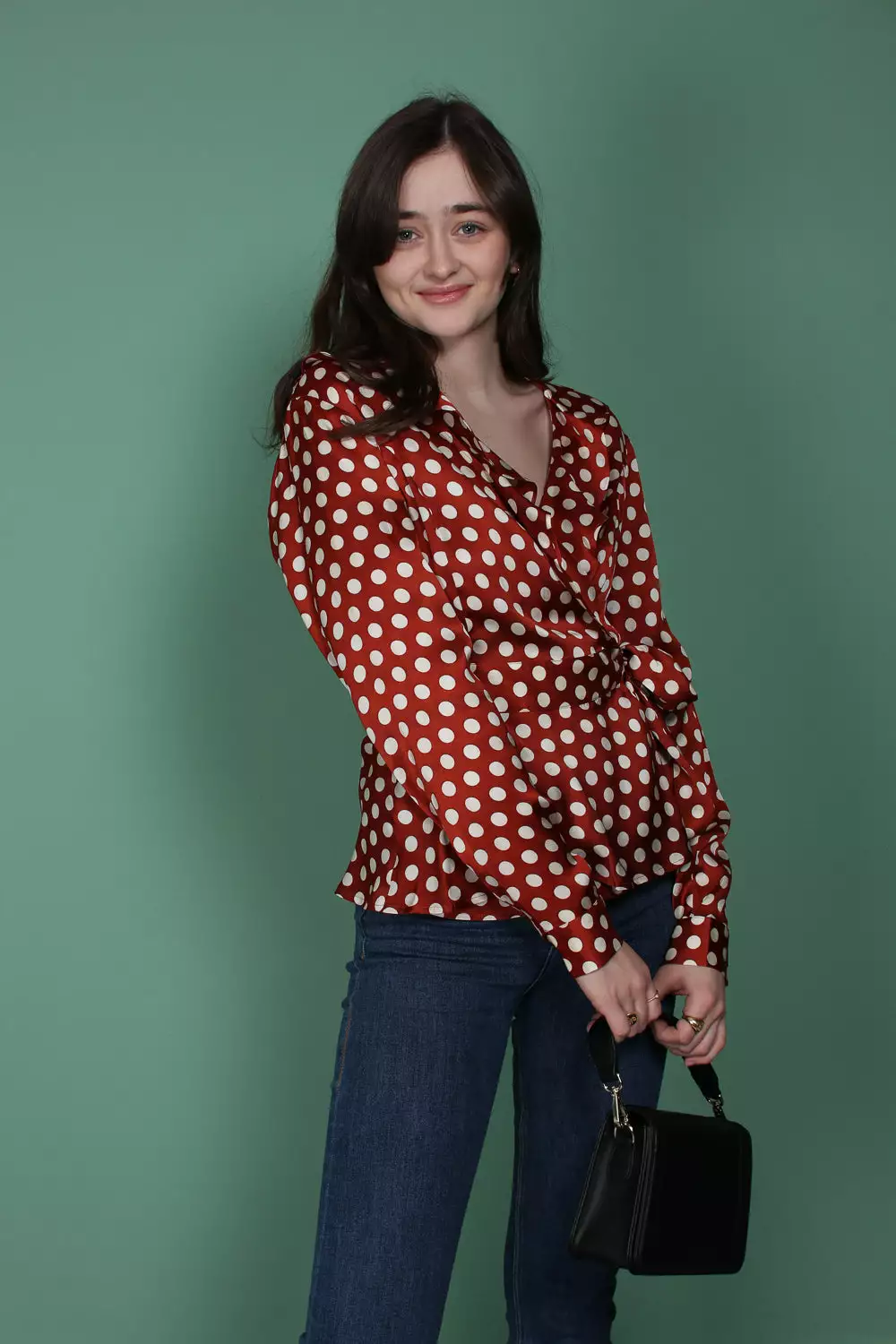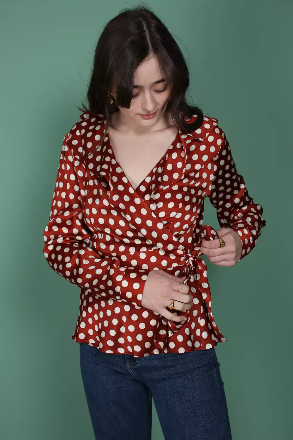 Wrapbluse med prikker på i brunt og hvitt. Volanger i kragen og utringningen med et feminint snitt.