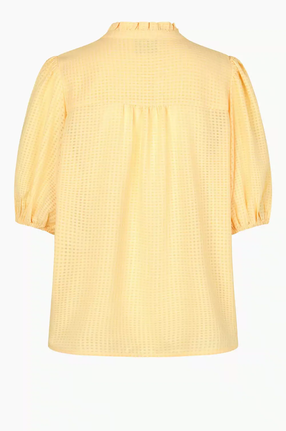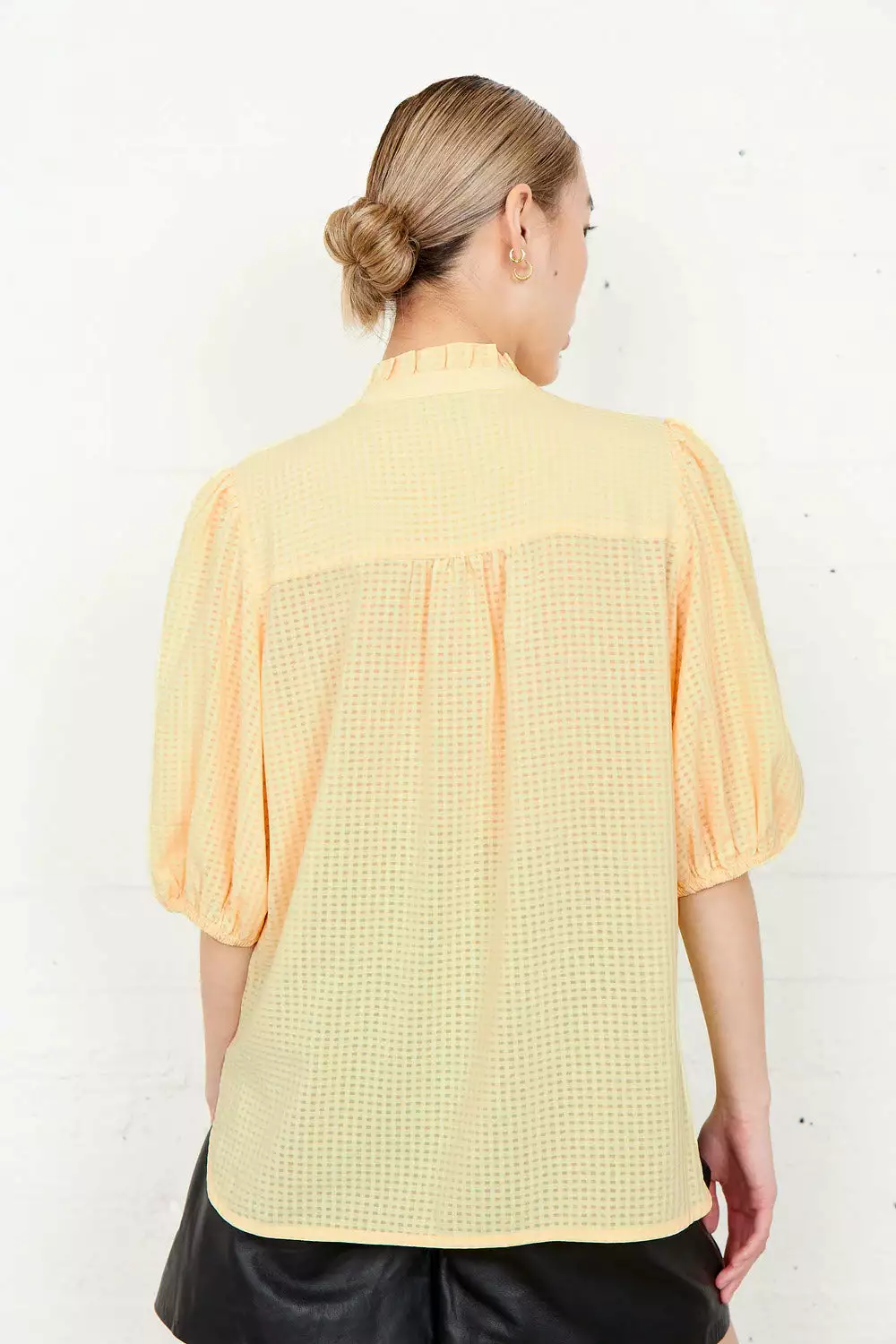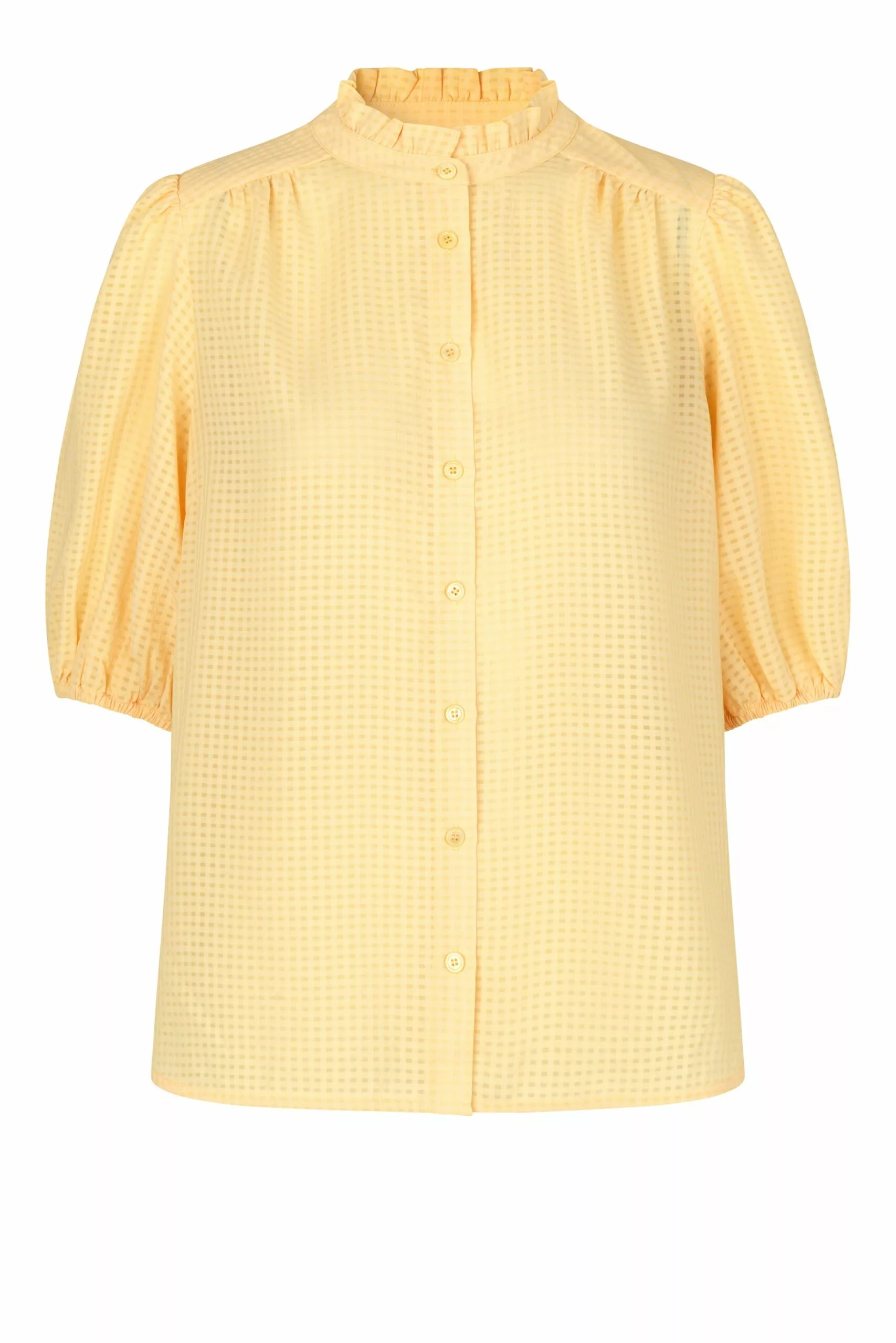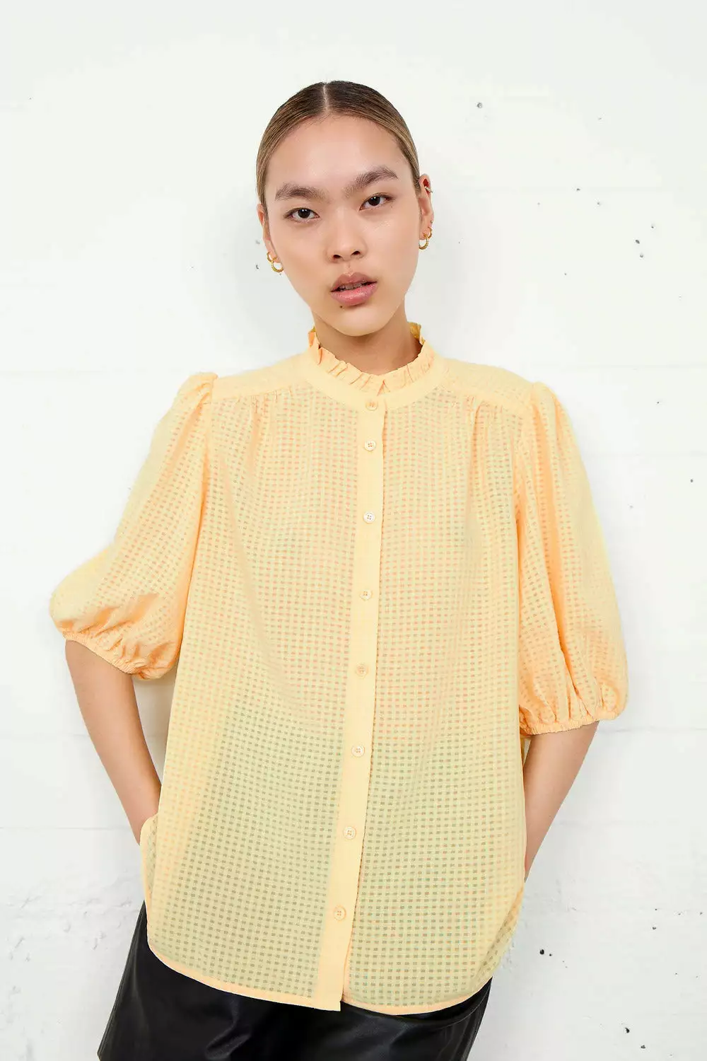 Tara New Shirt fra Second Female. Tara New Shirt tar den klassiske sommerskjorten, og gir den et moderne og spennende preg! Skjorten har halvlange ermer med volum, og et rutete, lett gjennomskinnelig stoff. Den klassiske skjortekragen er byttet ut med en halvhøy krage med rysjer, mens den lukkes med den klassiske knappestolpen i front.