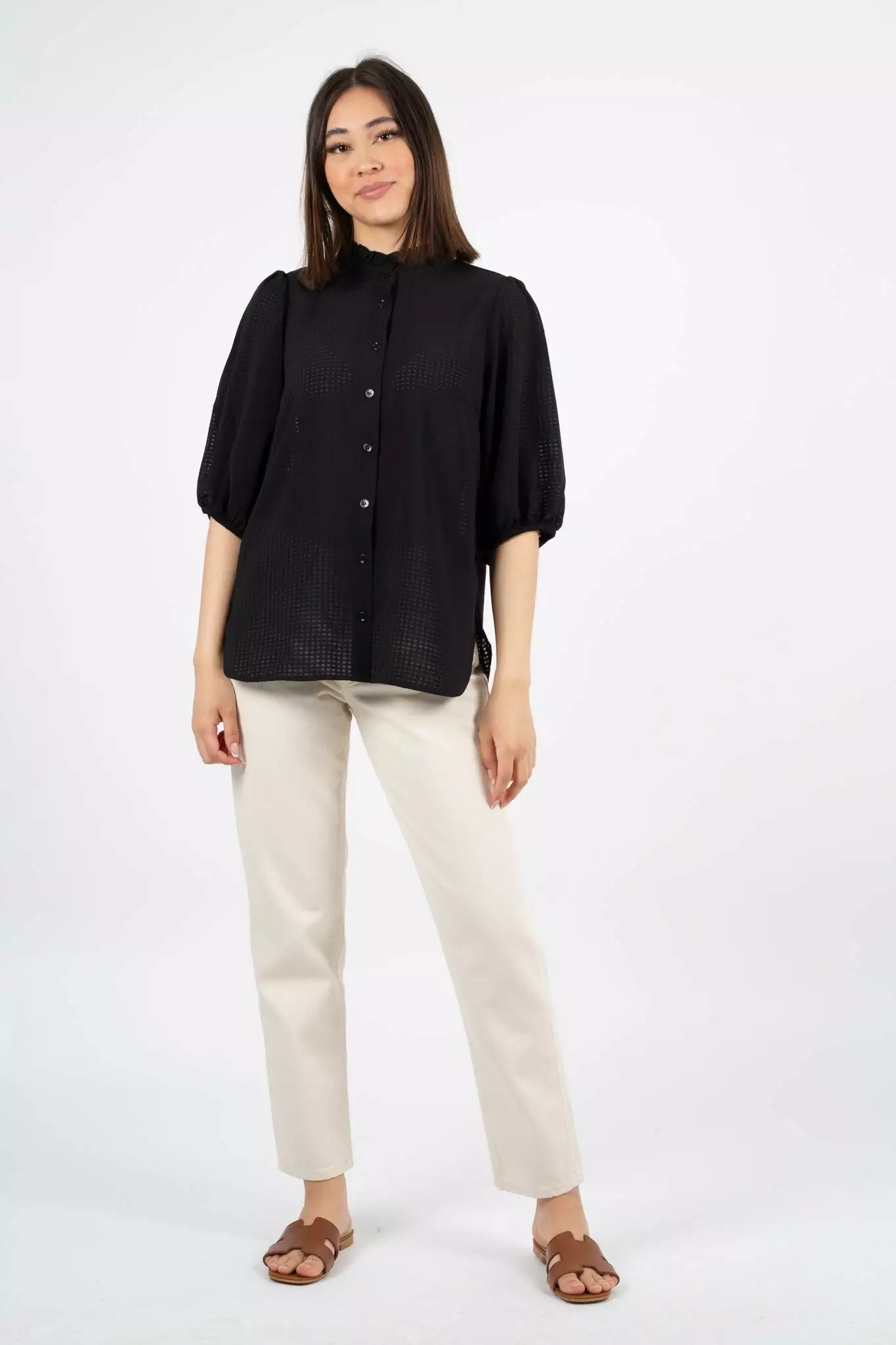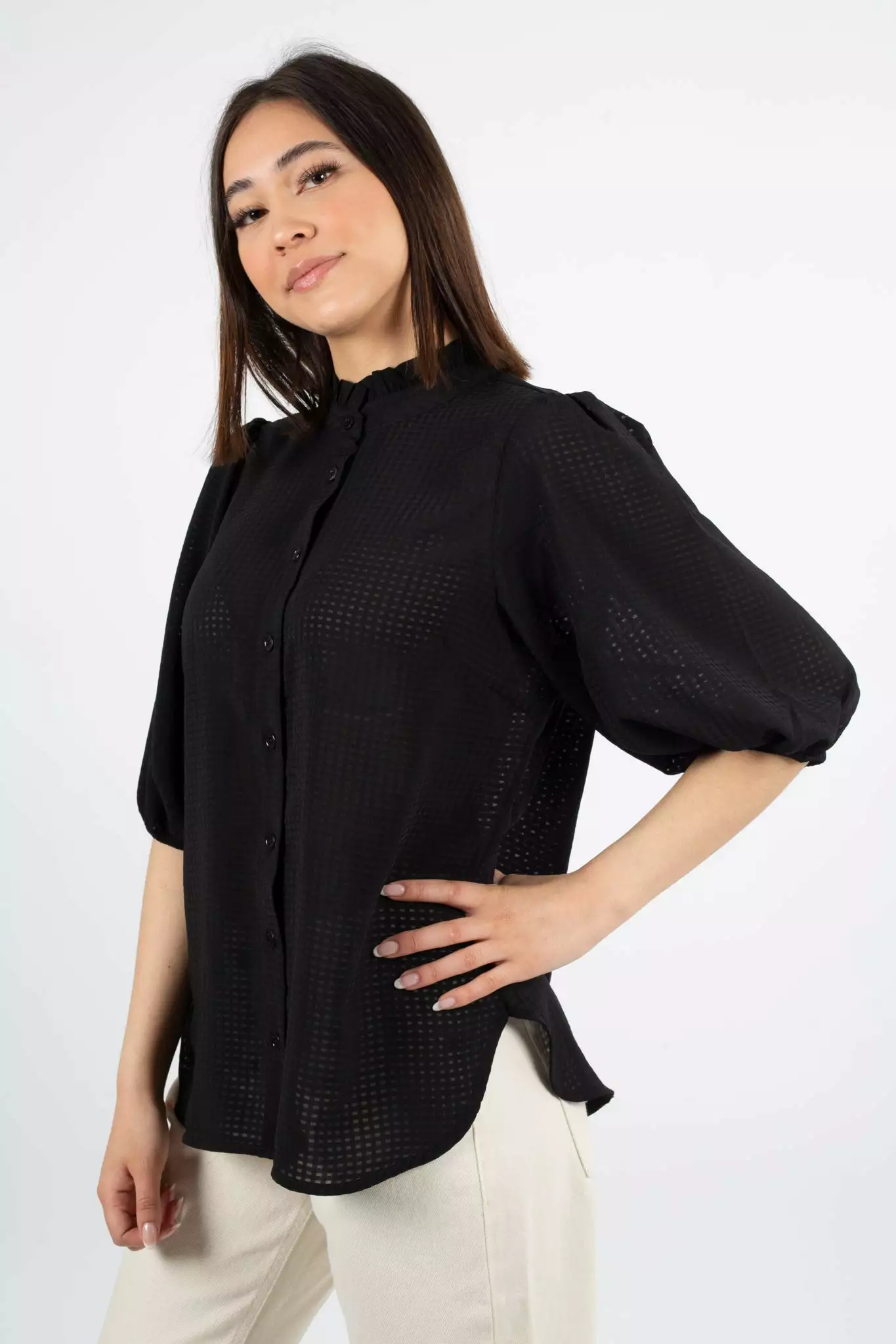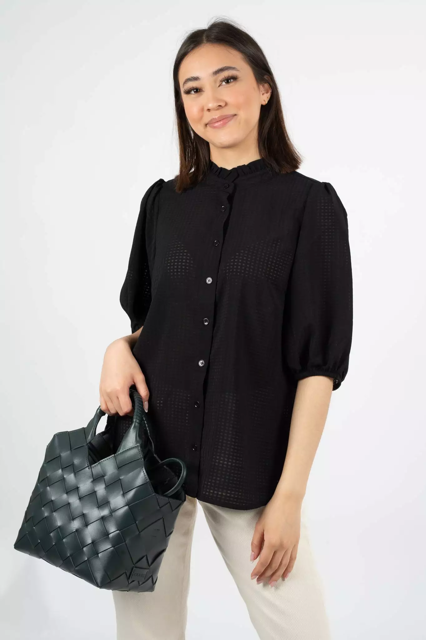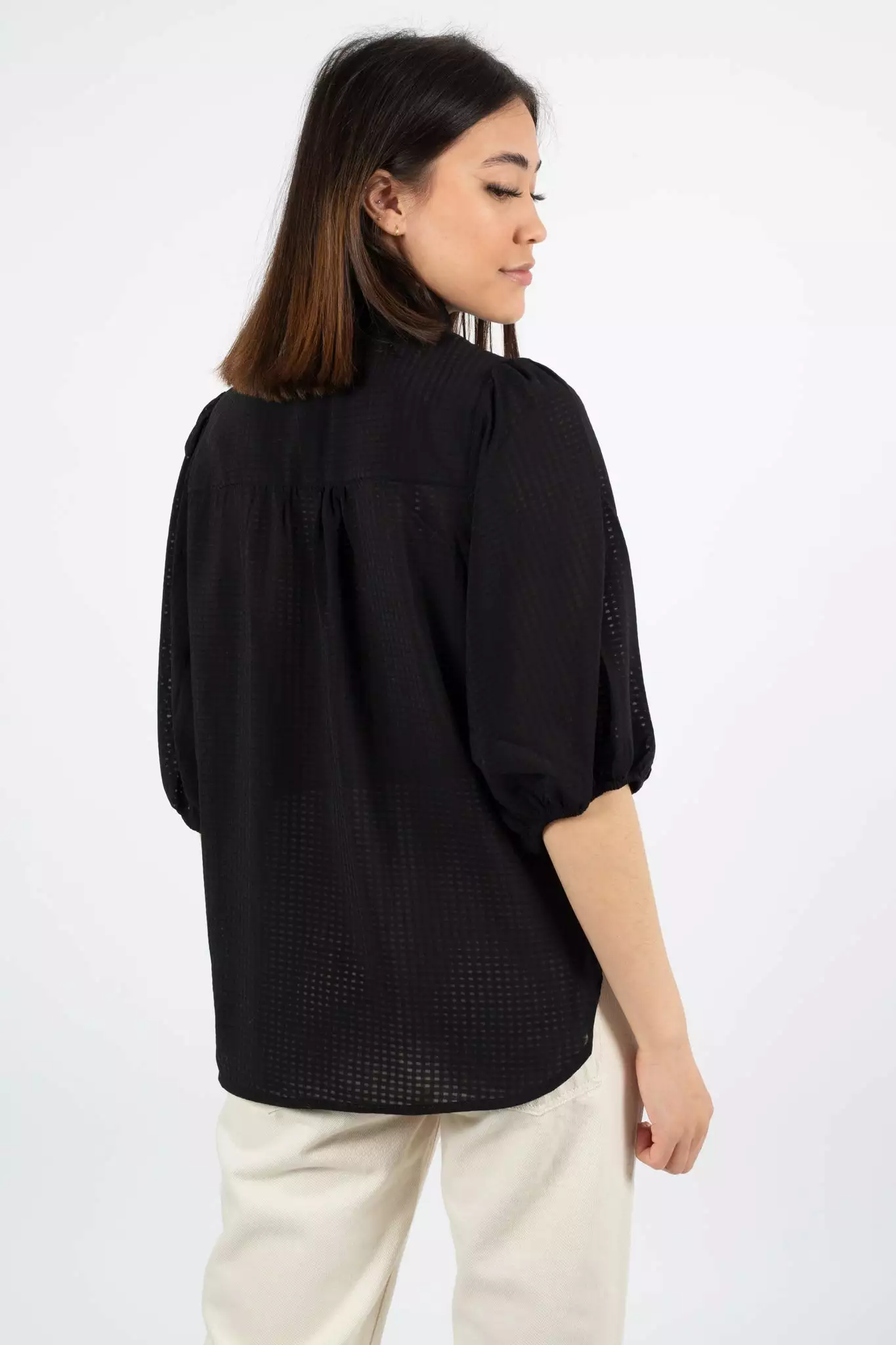 Tara SS Shirt fra Second Female. Enkel og fin skjorte med korte ermer i en elegant, strukturert, rutet kvalitet. Blusen har klassisk krage med detaljer langs halsen og knapp gjennom åpningen foran. Den har samlinger ved skulderen for voluminøse ermer og elastisk mansjett.