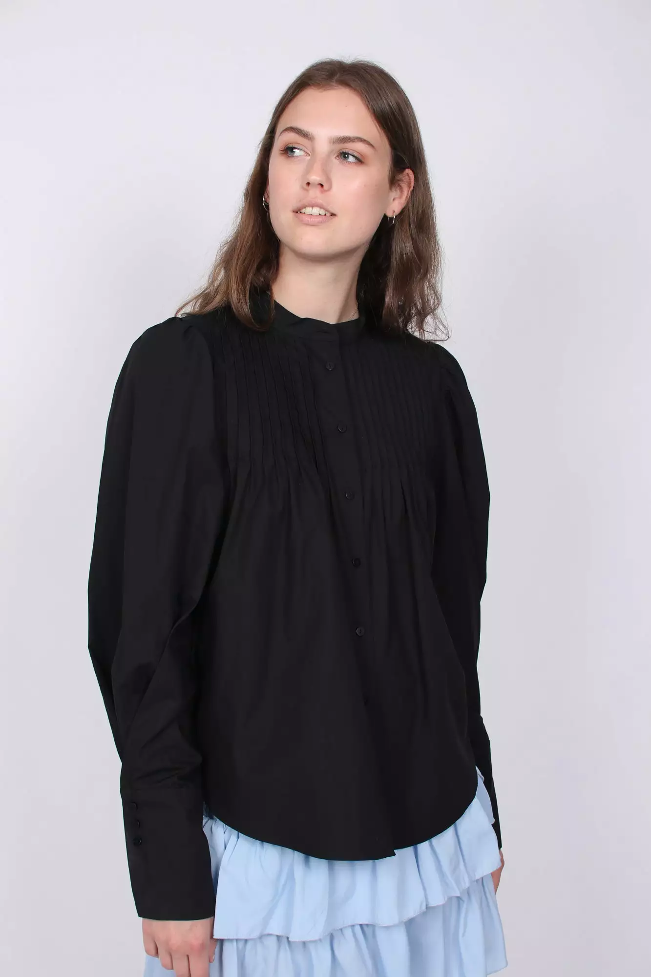 Stilig bluse med volumøse ermer og brede mansjetter. Denne vil defintivt se bra ut både på jobb og fest. Materiale: 100% Bomull