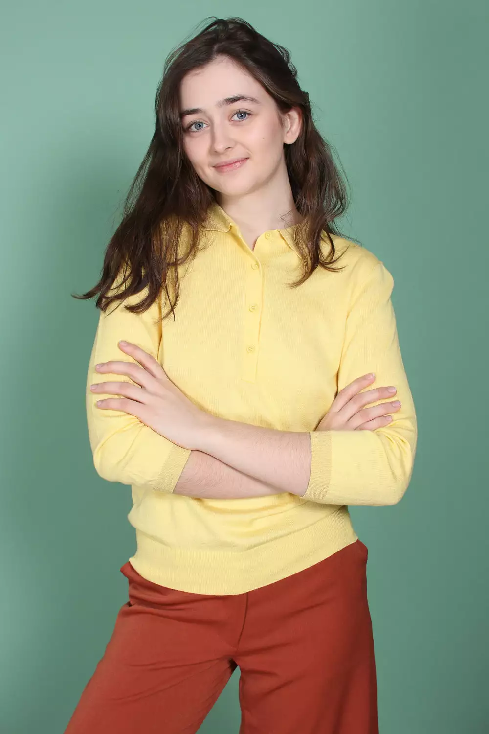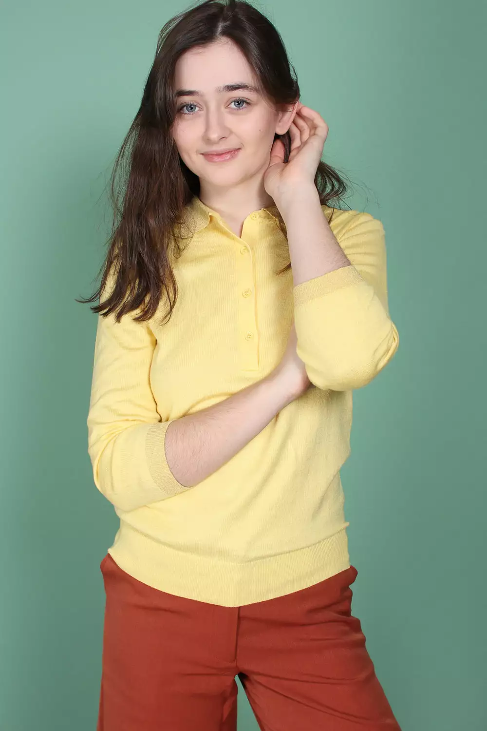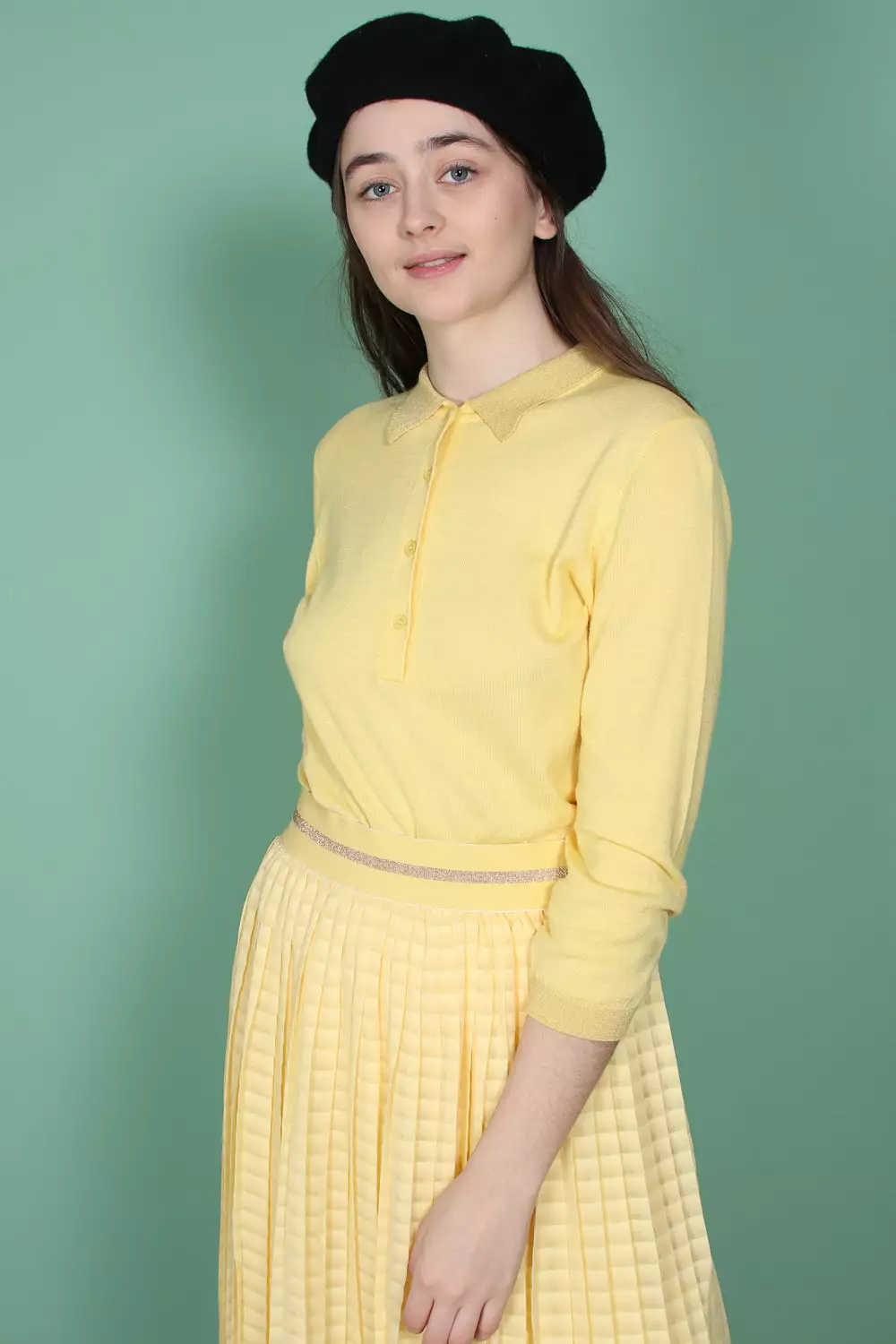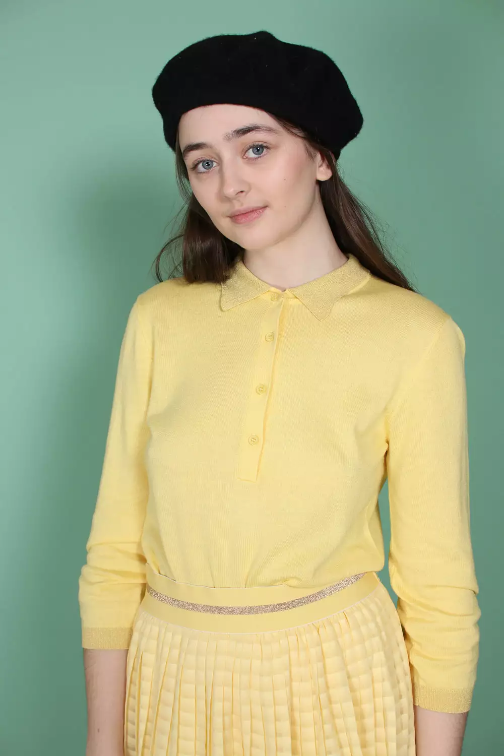 Fin gul genser med glitter rundt kragen. Genseren har fire knapper nedover brystet. Veldig Wes Anderson <3