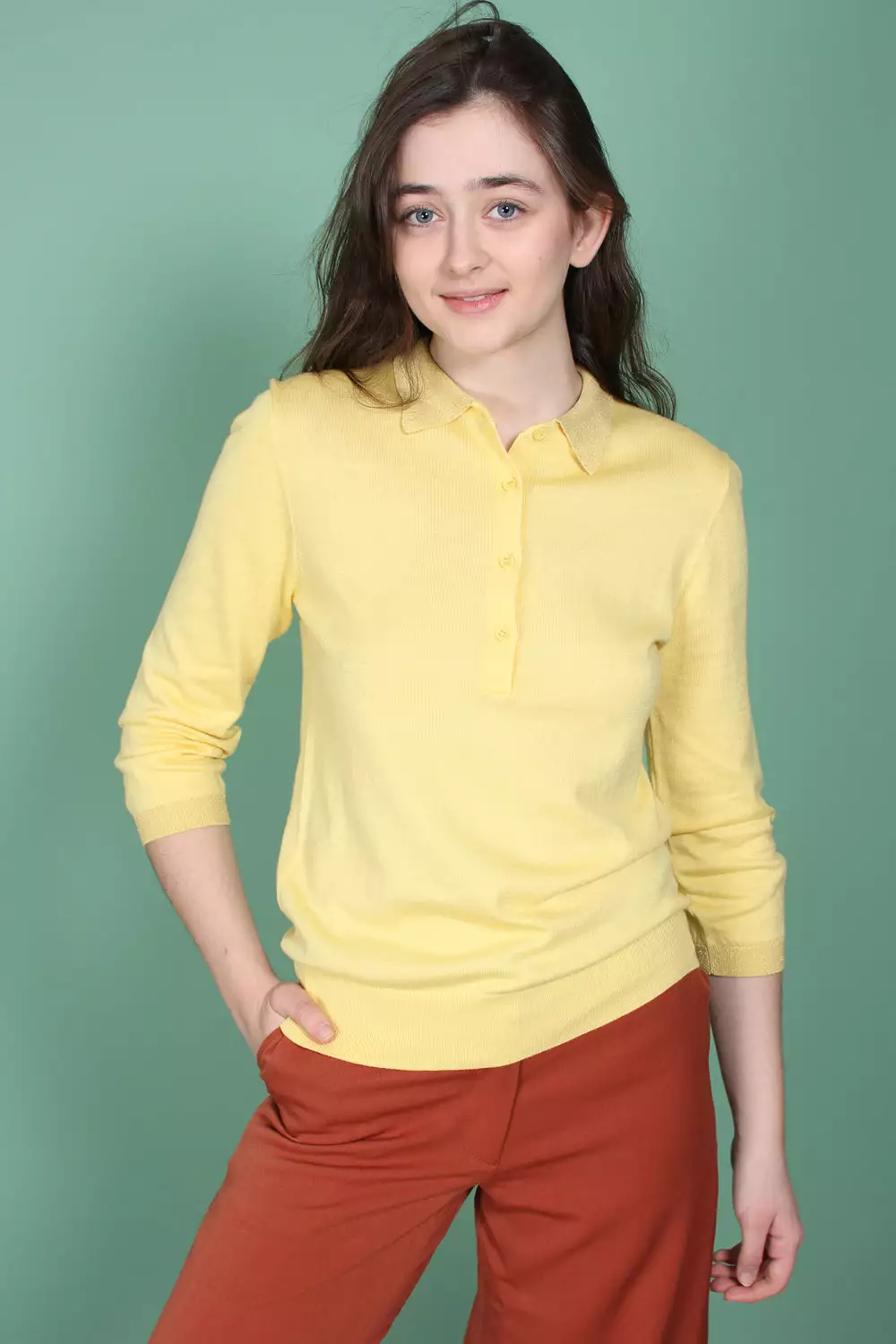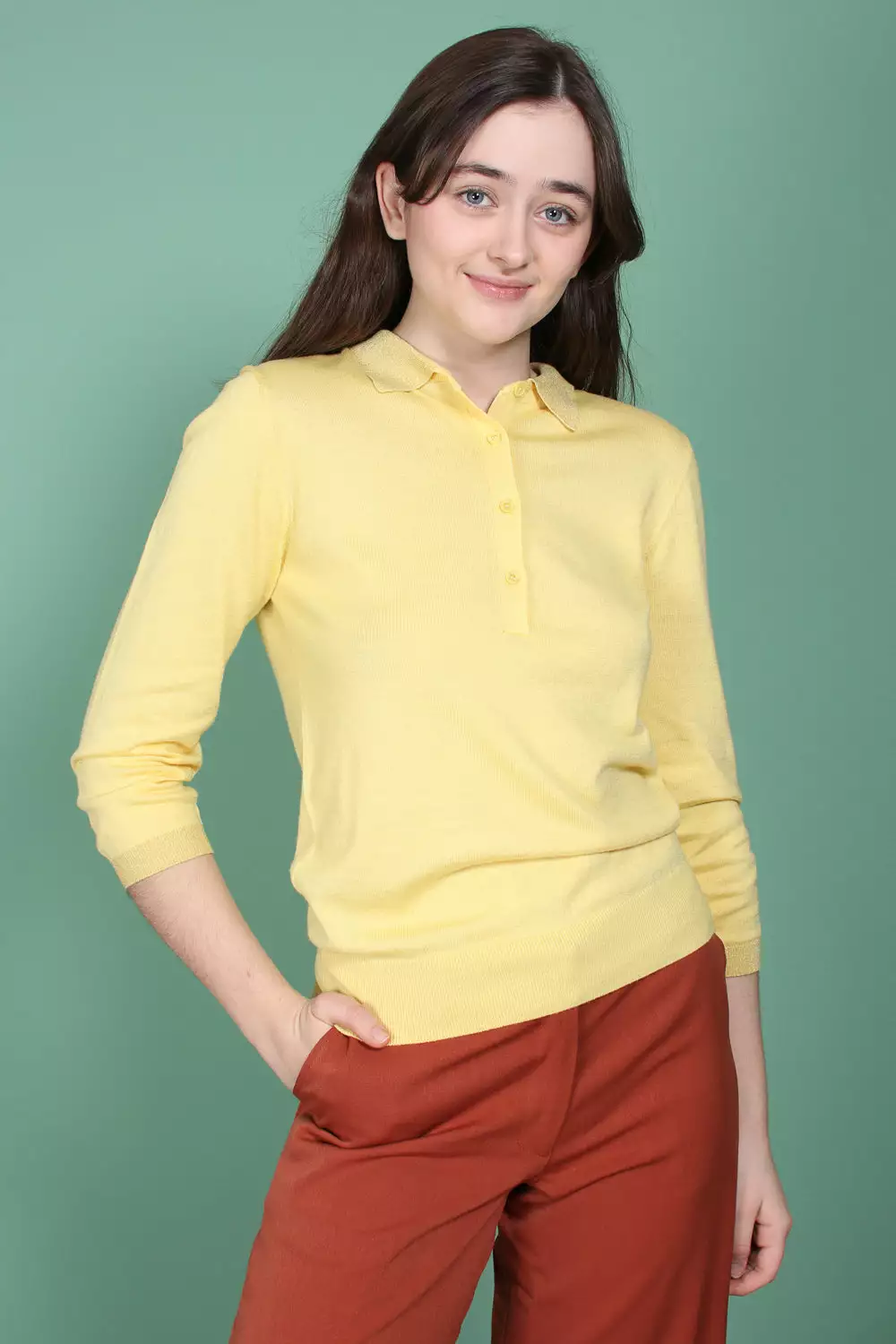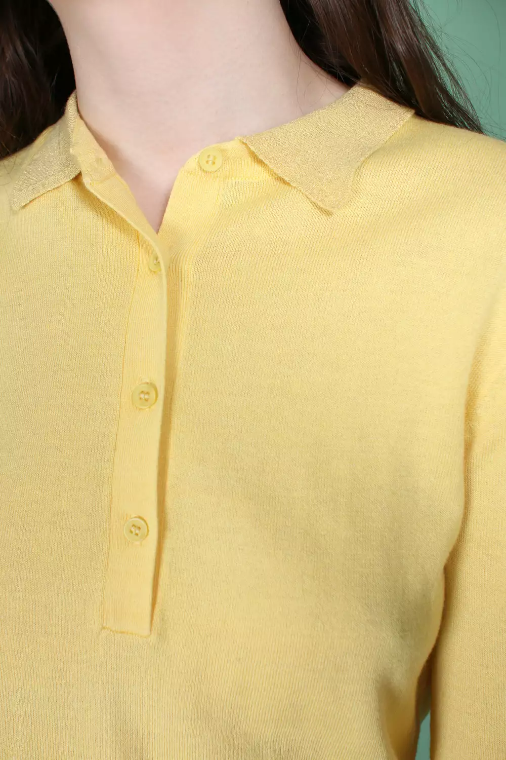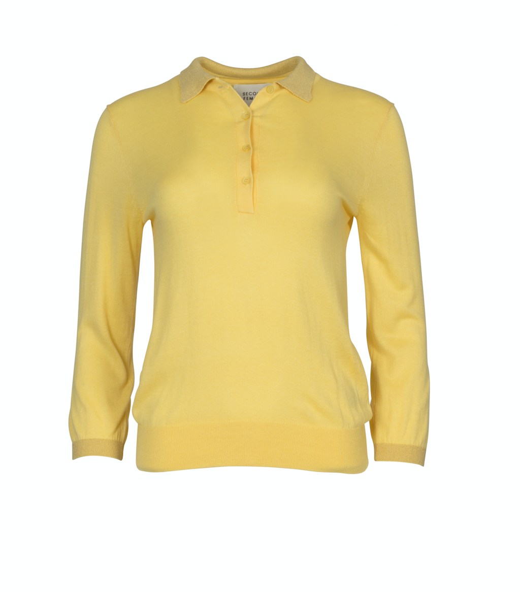 Fin gul genser med glitter rundt kragen. Genseren har fire knapper nedover brystet. Veldig Wes Anderson <3