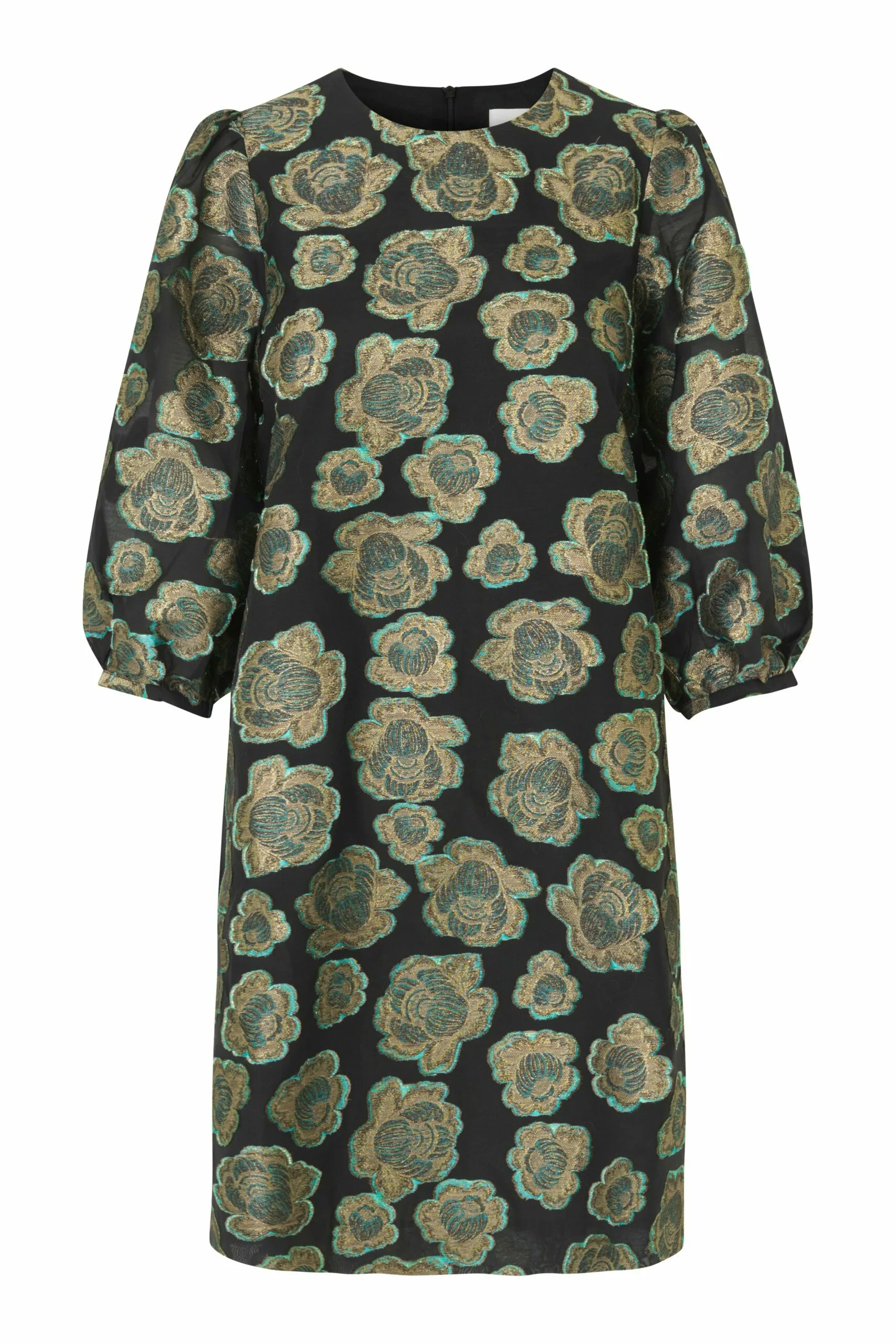 Yella Dress fra Second Female. Yella dress er en midikjole med blomstermønstret jacquard. Kjolen har avrundet hals og glidelås bak. Den har innvendig fôr, rynker på skuldrene som gir ekstra puff til de voluminøse ermene, og tynn mansjett med knappelukking bak.
